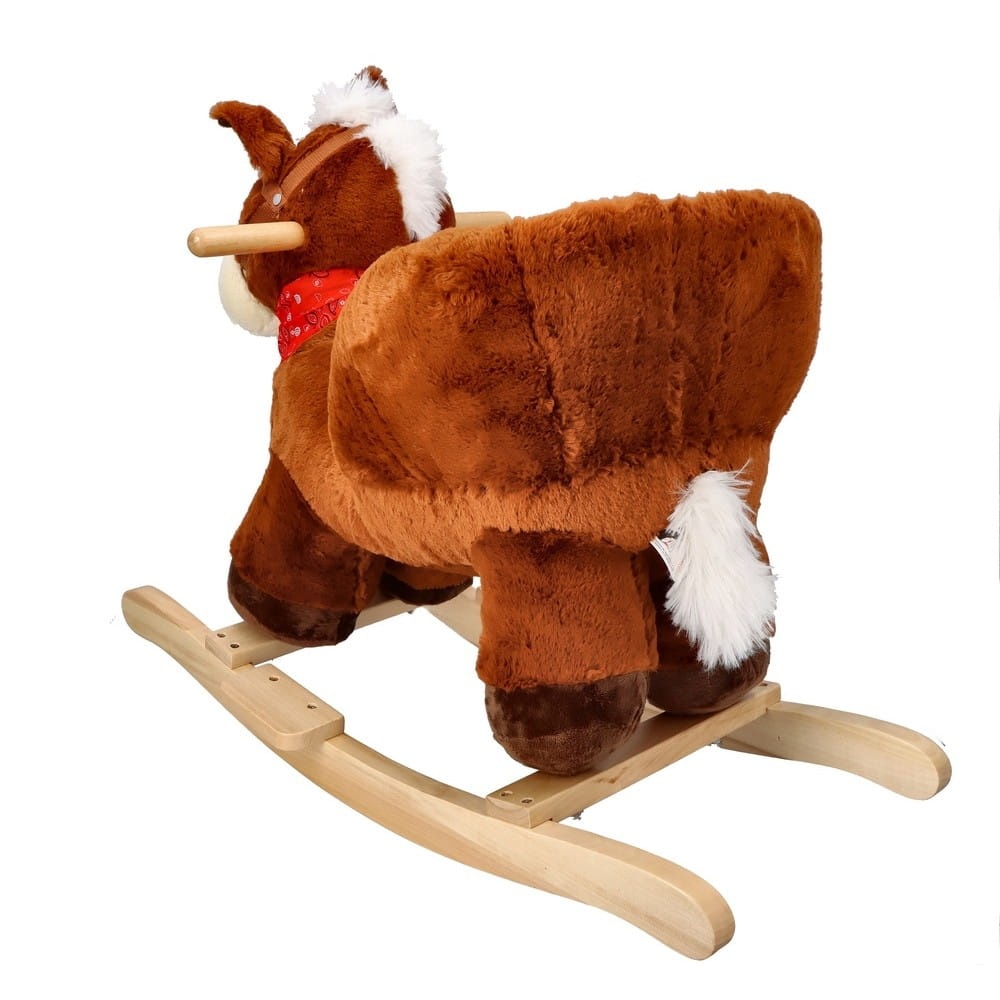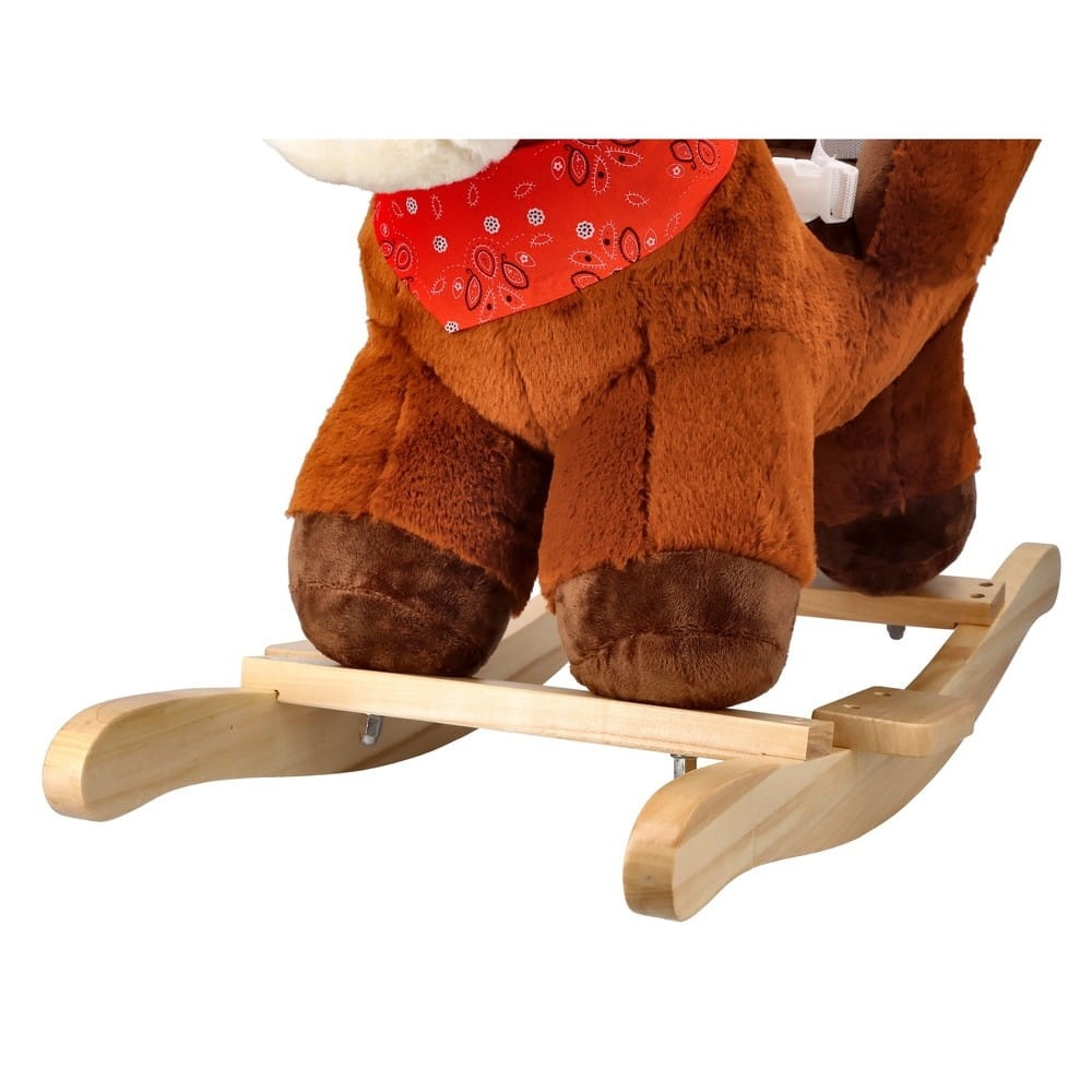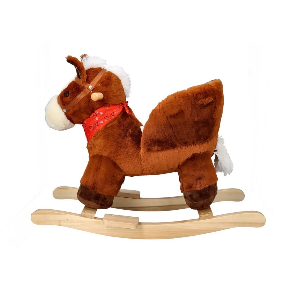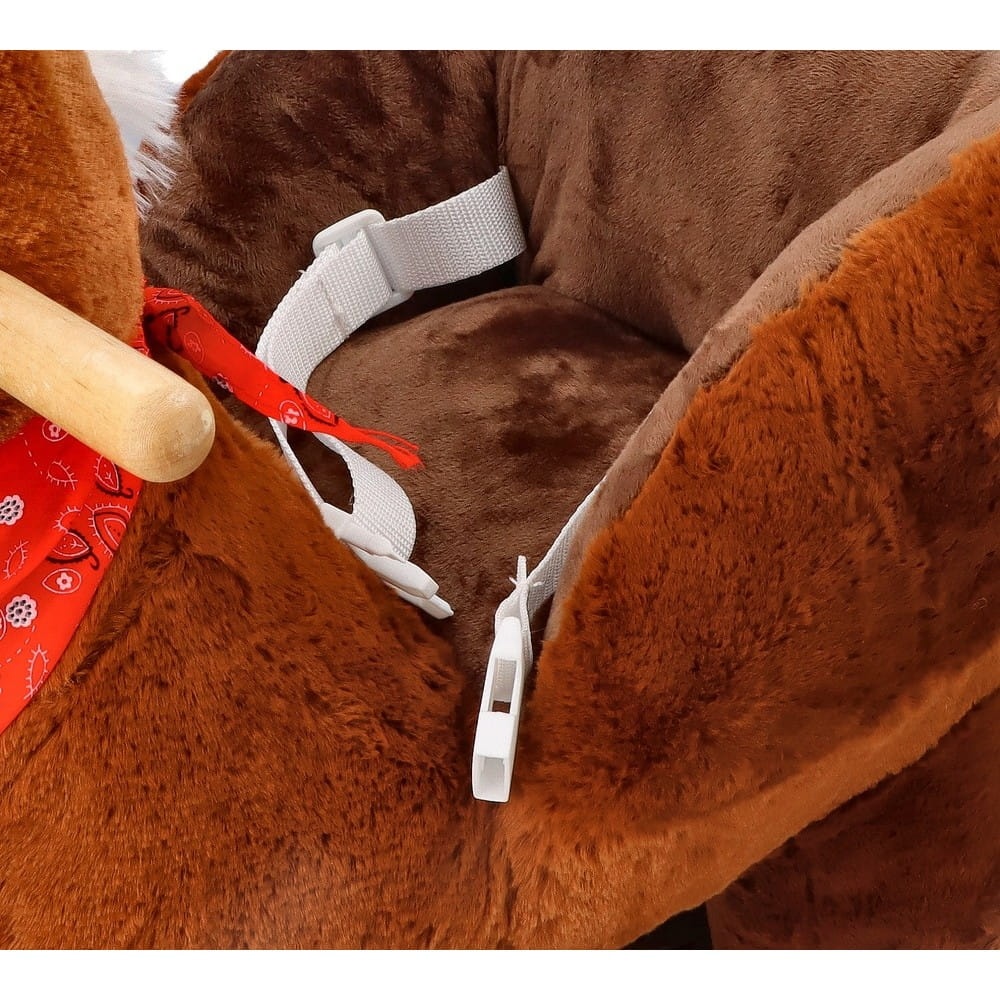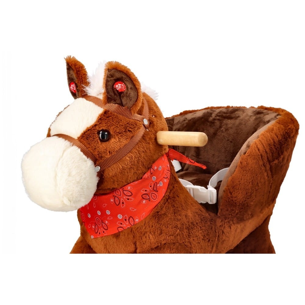 Śliczny tradycyjny konik do bujania z fotelikiem to świetny towarzysz zabaw i pierwszy przyjaciel dziecka. Zabawka będzie idealnym prezentem na roczek czy inną okazję. Konik wykonany jest z mięciutkiego i delikatnego w dotyku pluszowego materiału. Płozy i uchwyty na rączki wykonano z drewna. Całość utrzymana jest w brązowej kolorystyce z jaśniejszymi elementami, takimi jak pysk, grzywa i ogon. Konik wyposażony jest w fotelik z pasami bezpieczeństwa, dzięki czemu mogą się w nim bujać dzieci już od 10 miesiąca życia. Maluszek zapięty w pasy będzie mógł bezpiecznie korzystać z zabawki, bez ryzyka, że wypadnie z siedziska. Pas jest regulowany, dzięki czemu można go dostosować do aktualnych potrzeb.
