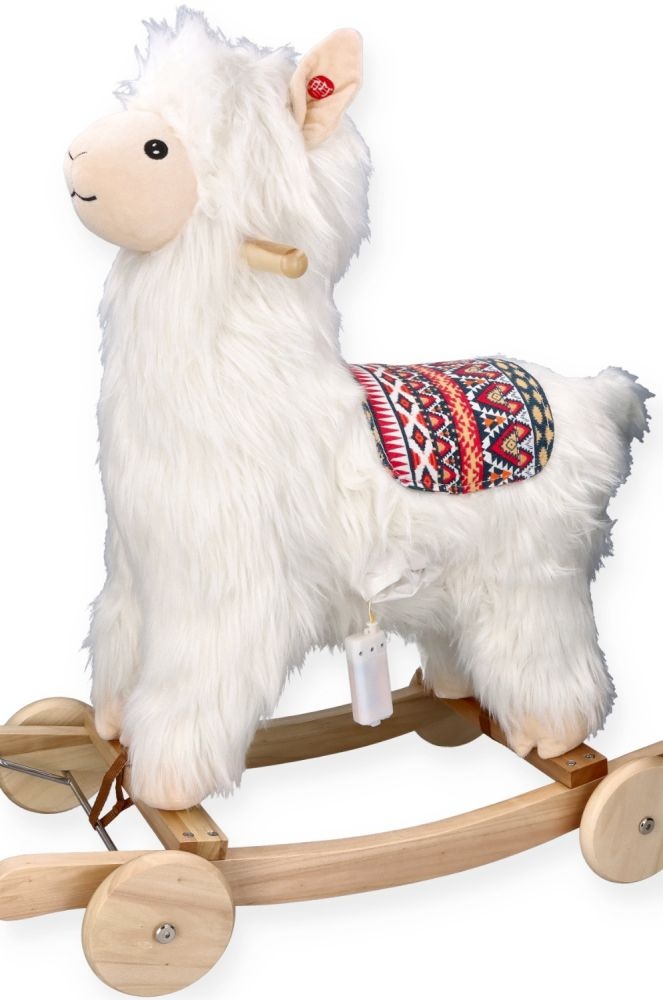 Alpaka ze ślicznego futerka. To co dodaje uroku to śliczny pyszczek, kolorowe siodło i kopytka. Posiada drewniane płozy i uchwyty zachowane w kolorach naturalnego drewna.