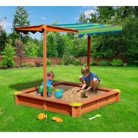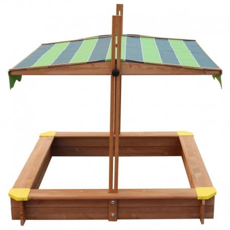 Duża, drewniana piaskownica AXi z regulowanym daszkiem idelanie sprawdzi się w przydomowym placu zabaw. Piaskownica została wyposażona w materiałowy daszek, który posiada możliwość regulacji wysokości i kąta nachylenia. Po całkowitym opuszczeniu daszku pełni on funkcję pokrywy piaskownicy, chroniąc ją przed warunkami atmosferycznymi oraz zwierzętami. Poszerzone obrzeża piaskownicy pełnią funkcję wygodnego siedziska. specjalne podłoże przeciw chwastom. W piaskownicy zmieści się ok 300 Kg piasku! Całość jest łatwa w montażu.