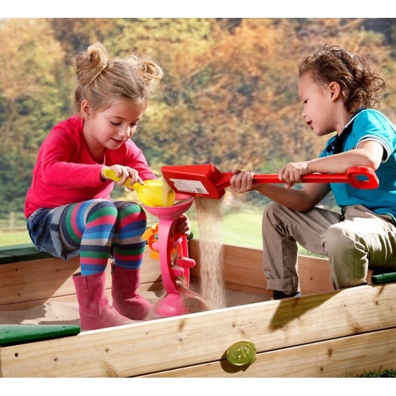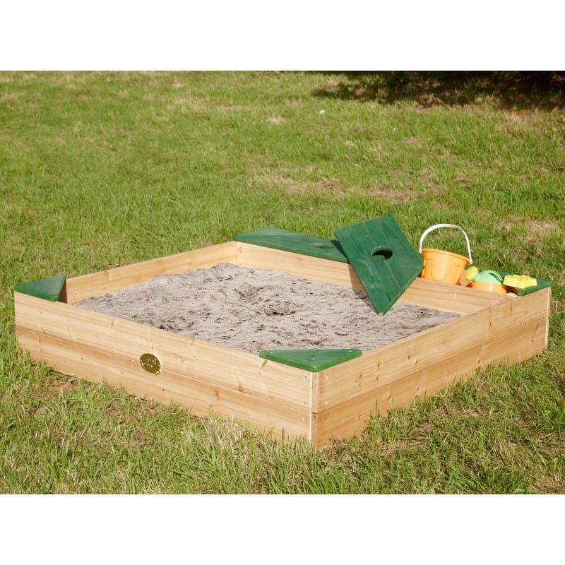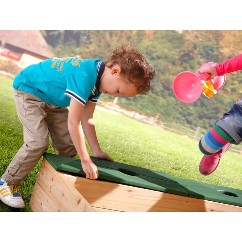 Piękna i wszechstronna, drewniana piaskownica AXi to doskonałe dopełnienie przydomowego placu zabaw. Piaskownica została wyposażona w schowek na akcesoria, w którym dzieci mogą przechowywać swoje łopatki i wiaderka. Schowek posiada drewniane pokrywy, które pełnią funkcję ławki. Dodatkowo na narożnikach znajdują się wygodne siedziska. Do zestawu został dołączony pokrowiec, która pełni funkcję pokrywy oraz specjalne podłoże przeciw chwastom. W piaskownicy zmieści się nawet 350 Kg piasku! Całość jest łatwa w montażu. Piasek i akcesoria nie znajdują się w zestawie. Piaskownica wykonana została z drewna z jodły kanadyjskiej.
