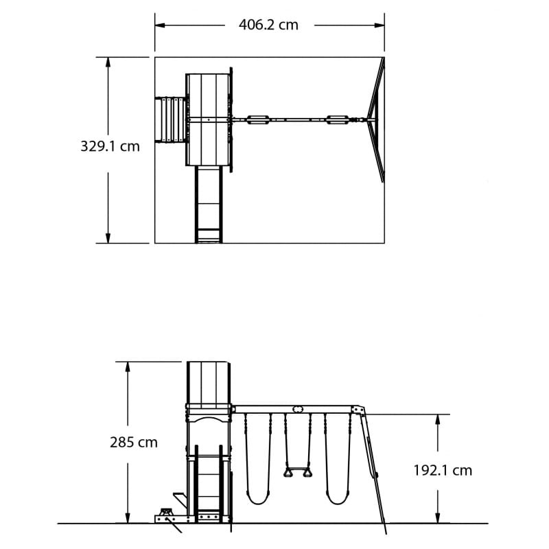 W dolnej części znajdziemy piaskownicę, ławeczkę ze stoliczkiem w formie baru oraz trzy solidne huśtawki z czego jedna z nich pełni rolę drążka gimnastycznego.