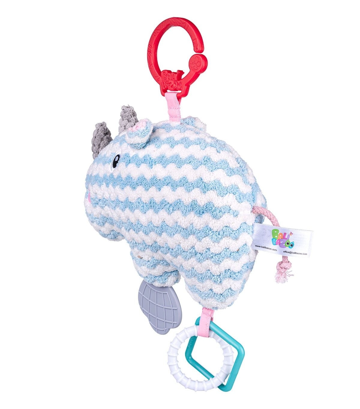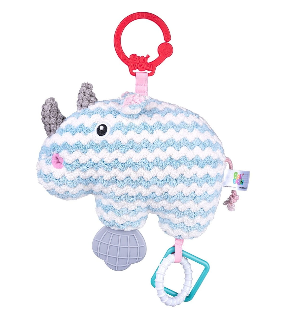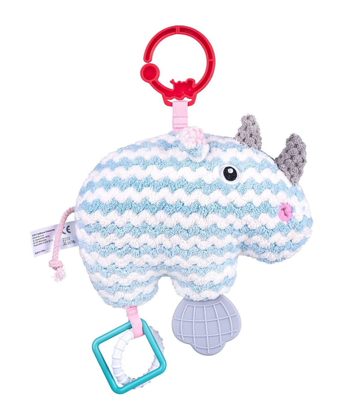 Pastelowy koleżka, w którym z pewnością zakocha się niejeden bobas! Nosorożec wyposażony jest w  3 gryzaczki, które przyniosą ulgę obolałym dziąsłom ząbkującego malucha. W zabawce kryje się dzwoneczek, dzięki czemu zwierzak wydaje wesoły dźwięk przy potrząsaniu. Wykonany z fakturowanego materiału Nosorożec, stymuluje zmysł dotyku i wzroku dziecka, a jego stonowane kolory nadają mu niepowtarzalnego charakteru. Praktyczny uchwyt pozwoli przymocować zabawkę w wybranym miejscu.