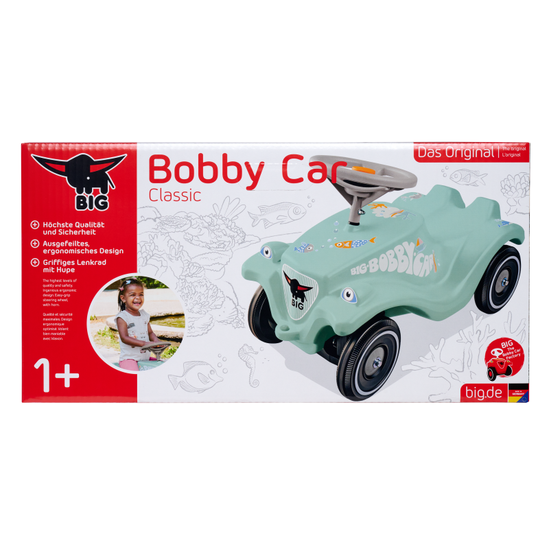 Big Bobby Car Classic Sea to klasyka zdefiniowana na nowo! Ten klasyczny jeździk Big jest solidny i wygląda niezwykle efektownie. W standardzie jeździk posiada sterowane, cichobieżne koła, dobrze wyprofilowaną bezpieczną kierownicę z klaksonem, nisko położony środek ciężkości, uchwyty holowniczy z przodu i hak do przyczepy z tyłu. Mniejsze dziecko może usiąść na samochodziku i jechać odpychając się nogami, większe dziecko może uklęknąć na jedno kolano i jechać odpychając się drugą nogą. Kolorystyka przypadnie do gustu chłopcom, jak i dziewczynkom.