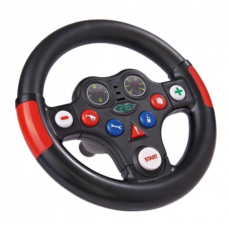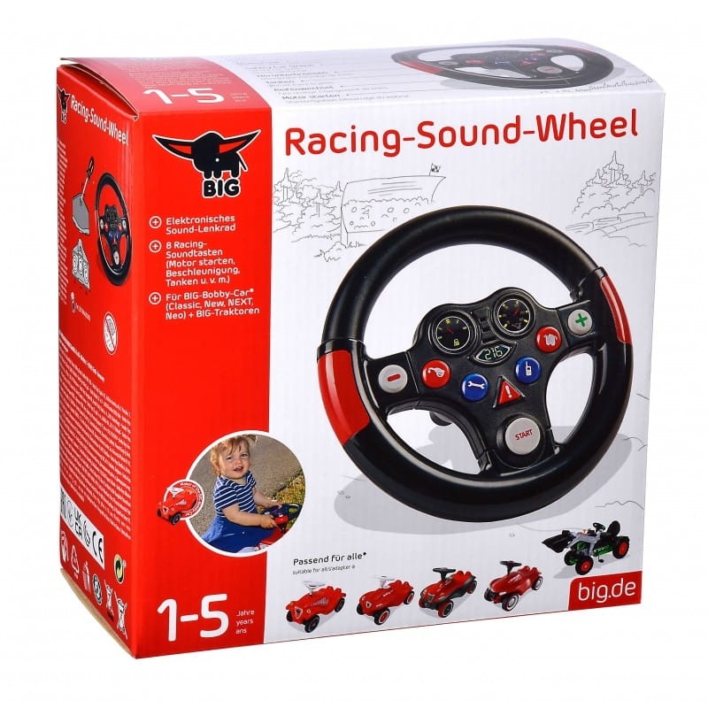 Kierownica Racing Sound Wheel firmy BIG to wspaniały dodatek do jeździków Bobby Car. Kierownica posiada 8 przycisków oraz wydaje charakterystyczne dźwięki. Szybko tankuj auto, załóż odpowiednie opony i ruszaj w drogę! Przyciskiem plus i minus zmieniaj biegi, podczas tej wspaniałej zabawy odkryjesz funkcję kolejnych przycisków. Niesamowita zabawa dla każdego malucha. Świetna kierownica dla małych rajdowców.