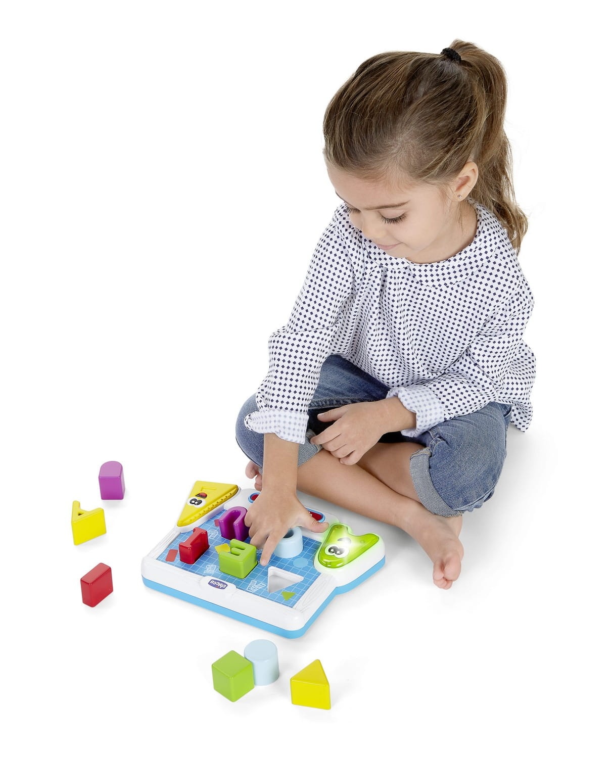 Zarówno kształty, jak i samogłoski są w wersji 3D, dzięki czemu dzieci mogą ich dotknąć i natychmiast zrozumieć, czy zostały umieszczone w odpowiednim otworze.