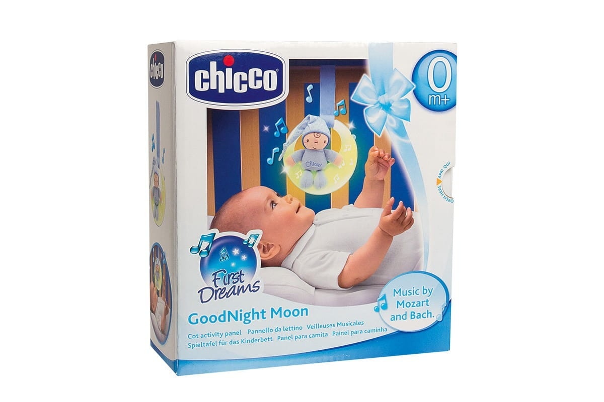 Muzyczny Księżyc Chicco to zabawka do łóżeczka, tworząca magiczną atmosferę przed snem. Delikatne efekty świetlne i wyciszające klasyczne melodie płynące z zabawki w kształcie księżyca oraz dołączona do niej urocza miękka maskotka wyciszają dziecko i ułatwiają zasypianie. Łatwo dopasowujący się pasek pozwala przypiąć zabawkę do ramy łóżeczka.