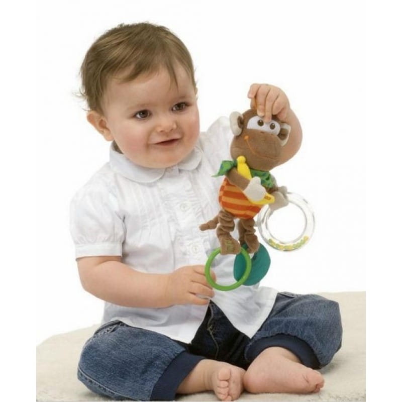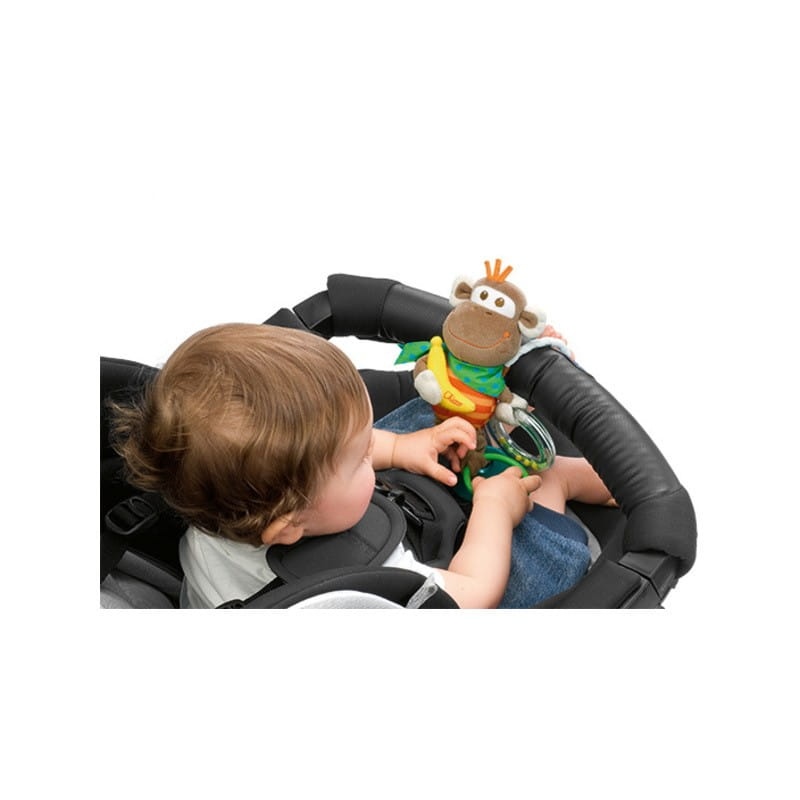 Szeroko uśmiechnięta, mięciutka maskotka małpka wykonana jest z tkaniny i tworzywa sztucznego. Zabawka stymuluje do odkrywania różnych sposobów zabawy: elementy z miękkiego plastiku są idealne podczas fazy ząbkowania, dając ulgę obolałym dziąsełkom, przezroczysty pierścień, który małpka trzyma w garści, wypełniony jest kolorowymi kuleczkami, które wesoło brzęczą, zachęcając dziecko do zabawy. Jedna noga małpki po pociągnięciu sprawia, że cała wibruje. Urocza mała małpka to zabawka, którą można zabierać ze sobą na spacery, przyczepiając ją do wózka specjalnym uchwytem do mocowania. Zabawkę można prać w pralce.