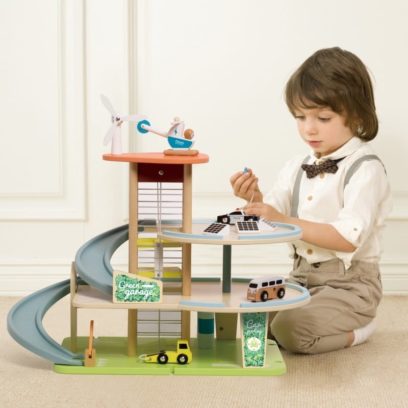 Drewniany wielopoziomowy parking od marki Classic World ze stacją ładowania pojazdów elektrycznych, windą, panelami fotowoltaicznymi, wiatrakiem oraz lądowiskiem dla helikoptera rozbudzi wyobraźnię każdego fana samochodów oraz motoryzacji. Aby pojazd mógł dostać się na parking lub z niego wyjechać należy podnieść szlaban. Dzięki windzie (która porusza się ręcznie) pojazdy mogą przemieszczać się pomiędzy piętrami. Szybki zjazd samochodów z poszczególnych poziomów umożliwia specjalny, kręty zjazd. Garaż wyposażony jest także w stację ładowania pojazdów elektrycznych. Ponadto w zestawie znajdują się 3 samochodziki oraz helikopter.