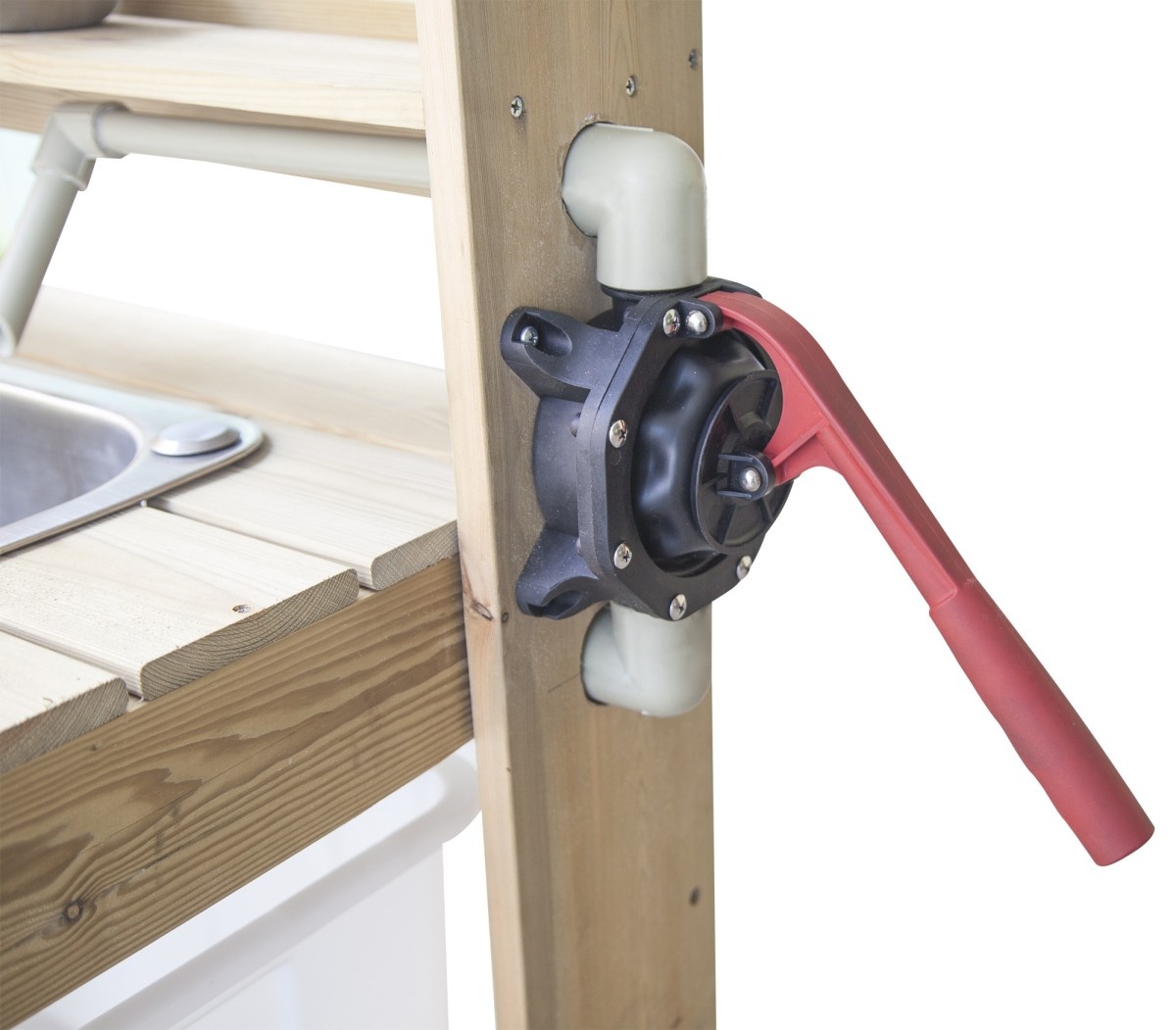 Układ opiera się na ręcznej pompie mechanicznej działającej w obiegu zamkniętym. Po napełnieniu dolnego zbiornika rezerwowego, dziecko naciskając dźwignię pompy (lub przycisk), tłoczy wodę do kranu. Woda spływająca ze zlewu wraca rurami z powrotem do zbiornika, co pozwala na ciągłą zabawę bez konieczności podłączania zewnętrznego węża ogrodowego.