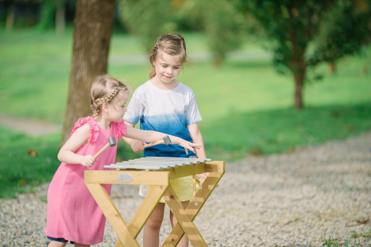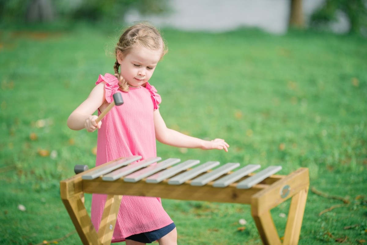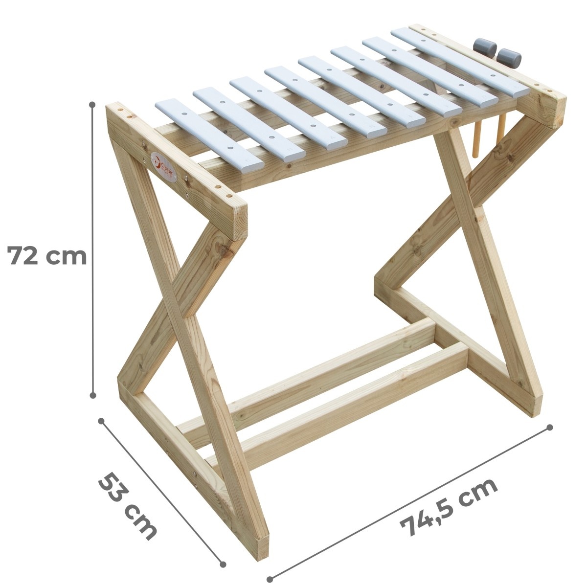 Drewniany ksylofon wolnostojący Classic World to profesjonalnie zaprojektowany instrument zewnętrzny, który pozwala dzieciom odkrywać ich muzyczną stronę. Ten solidny metalofon został stworzony z myślą o zabawie na świeżym powietrzu, stanowiąc doskonałe wyposażenie ogrodów, placów zabaw oraz kącików muzycznych w przedszkolach. Dzięki dużej konstrukcji i precyzyjnie nastrojonym metalowym płytkom, instrument oferuje czyste i przyjemne dźwięki, które zachęcają najmłodszych do muzycznych eksperymentów. Konstrukcja urządzenia oparta jest na stabilnym, drewnianym stelażu, co gwarantuje bezpieczeństwo i trwałość podczas intensywnego użytkowania przez grupę dzieci. Instrument muzyczny XXL posiada specjalne miejsce na pałeczki, co ułatwia utrzymanie porządku po zakończonej zabawie. To wyjątkowe narzędzie dydaktyczne nie tylko bawi, ale przede wszystkim stymuluje słuch, rozwija poczucie rytmu oraz pozwala na ekspresję artystyczną w naturalnym otoczeniu. Każde uderzenie w kolorowe płytki to krok w stronę rozwoju wrażliwości muzycznej dziecka.