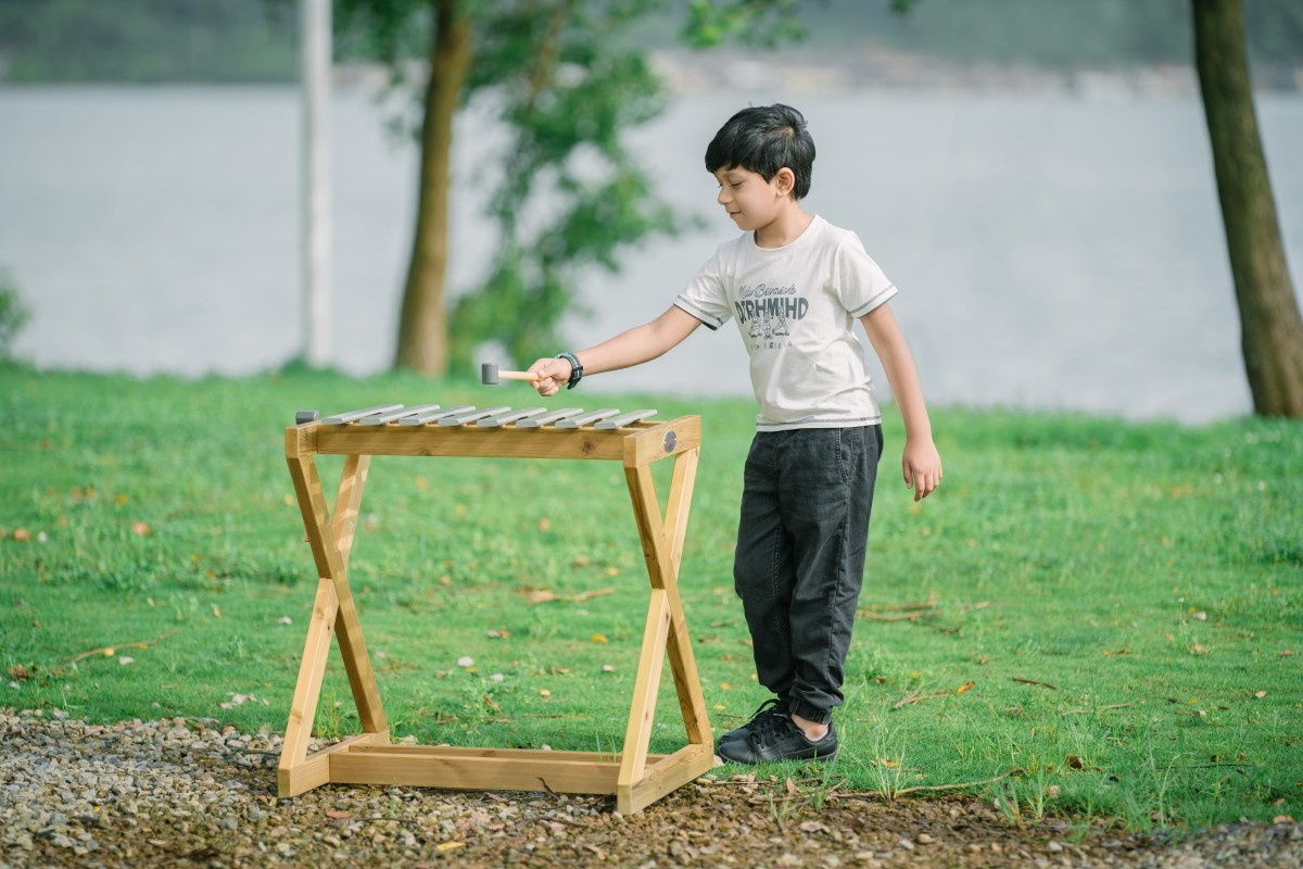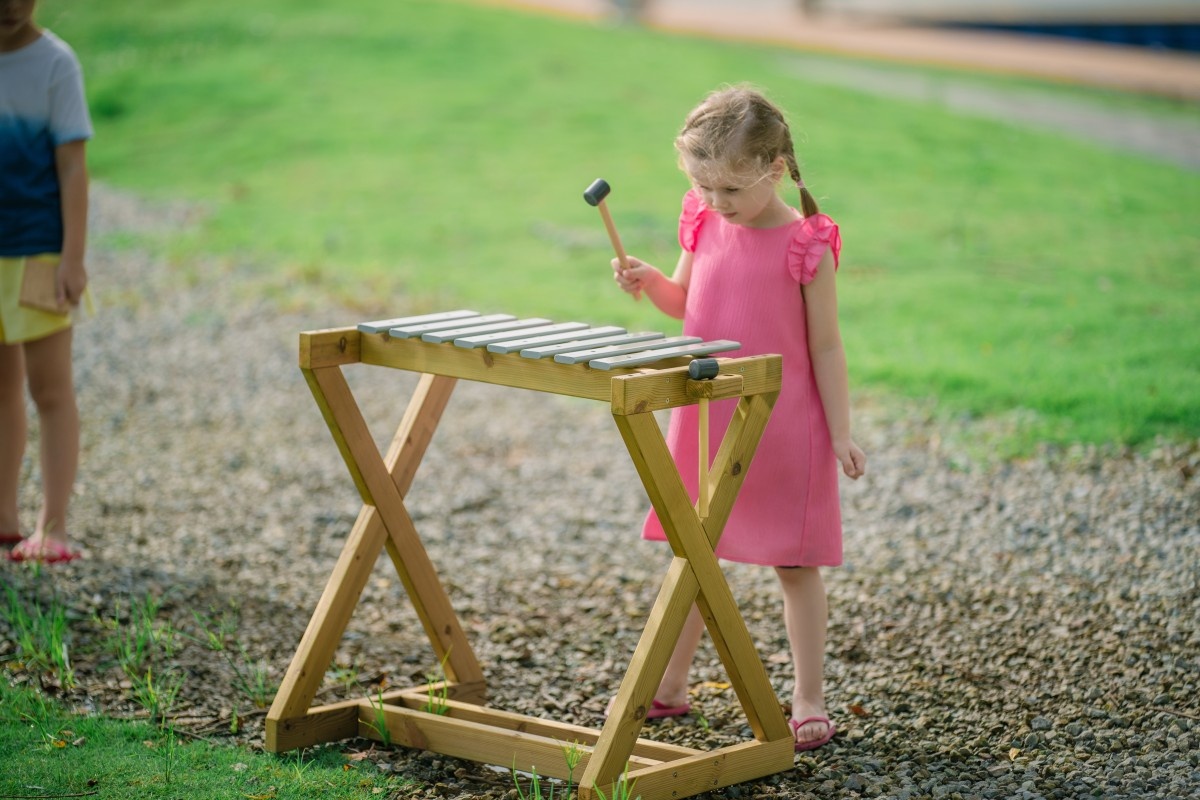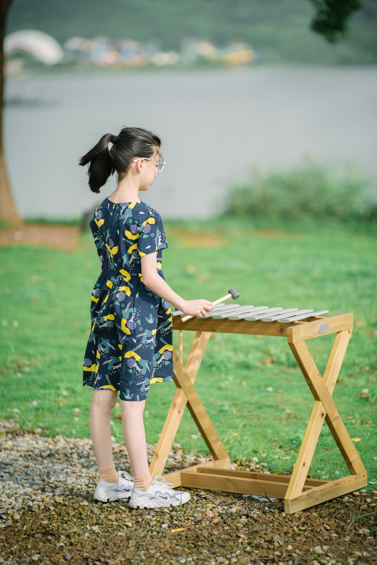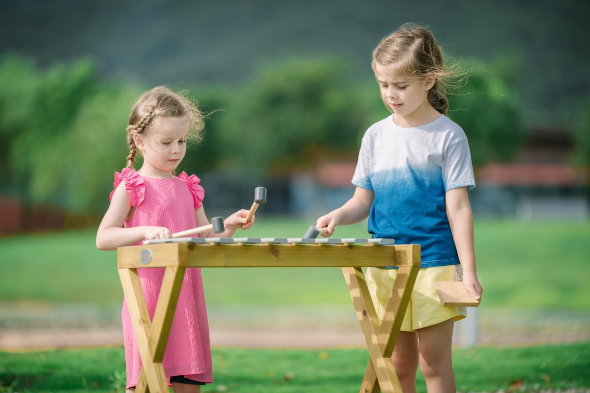 Drewniany ksylofon wolnostojący Classic World to profesjonalnie zaprojektowany instrument zewnętrzny, który pozwala dzieciom odkrywać ich muzyczną stronę. Ten solidny metalofon został stworzony z myślą o zabawie na świeżym powietrzu, stanowiąc doskonałe wyposażenie ogrodów, placów zabaw oraz kącików muzycznych w przedszkolach. Dzięki dużej konstrukcji i precyzyjnie nastrojonym metalowym płytkom, instrument oferuje czyste i przyjemne dźwięki, które zachęcają najmłodszych do muzycznych eksperymentów. Konstrukcja urządzenia oparta jest na stabilnym, drewnianym stelażu, co gwarantuje bezpieczeństwo i trwałość podczas intensywnego użytkowania przez grupę dzieci. Instrument muzyczny XXL posiada specjalne miejsce na pałeczki, co ułatwia utrzymanie porządku po zakończonej zabawie. To wyjątkowe narzędzie dydaktyczne nie tylko bawi, ale przede wszystkim stymuluje słuch, rozwija poczucie rytmu oraz pozwala na ekspresję artystyczną w naturalnym otoczeniu. Każde uderzenie w kolorowe płytki to krok w stronę rozwoju wrażliwości muzycznej dziecka.