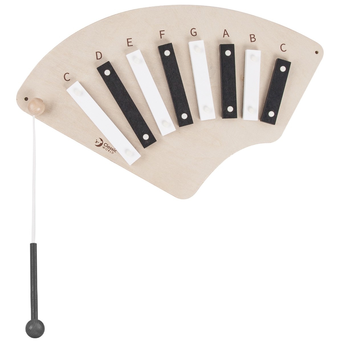 Zabezpieczenie przed dekompletacją: Pałeczka do gry jest na stałe zintegrowana z drewnianym panelem za pomocą mocnego sznurka. Rozwiązuje to największą bolączkę wychowawców – eliminuje ryzyko zagubienia uderzaka lub użycia go przez dziecko jako niebezpiecznego narzędzia podczas zabawy w grupie.