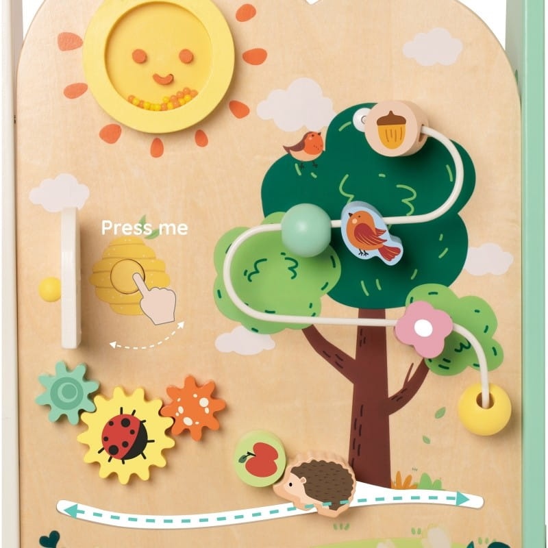 • - Rozwój zdolności motorycznych - Przesuwanie koralików, sortowanie klocków i zabawa kołami zębatymi wymagają precyzji i siły, co wspiera rozwój małej motoryki i wzmacnia mięśnie dłoni.