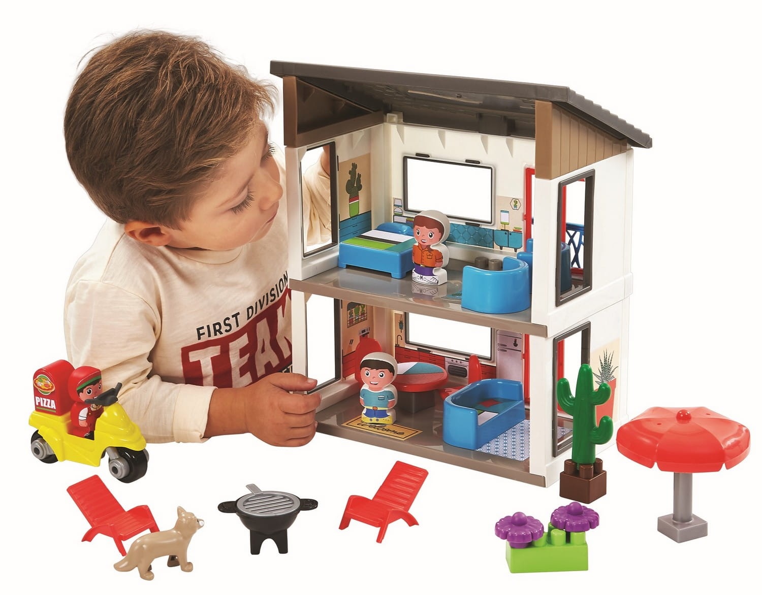 Nowoczesna, piętrowa willa z akcesoriami pozwoli dzieciom odgrywać scenki z życia rodzinnego. Na parterze znajduje się salon z kuchnią, natomiast na piętrze umiejscowiona jest sypialnia. Zestaw zawiera także figurki ludzi, figurkę pieska oraz akcesoria ogrodowe, takie jak parasol, grill i leżaki.