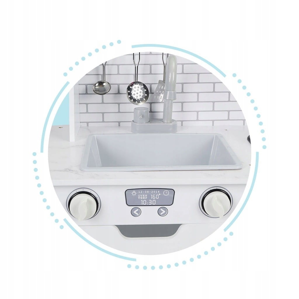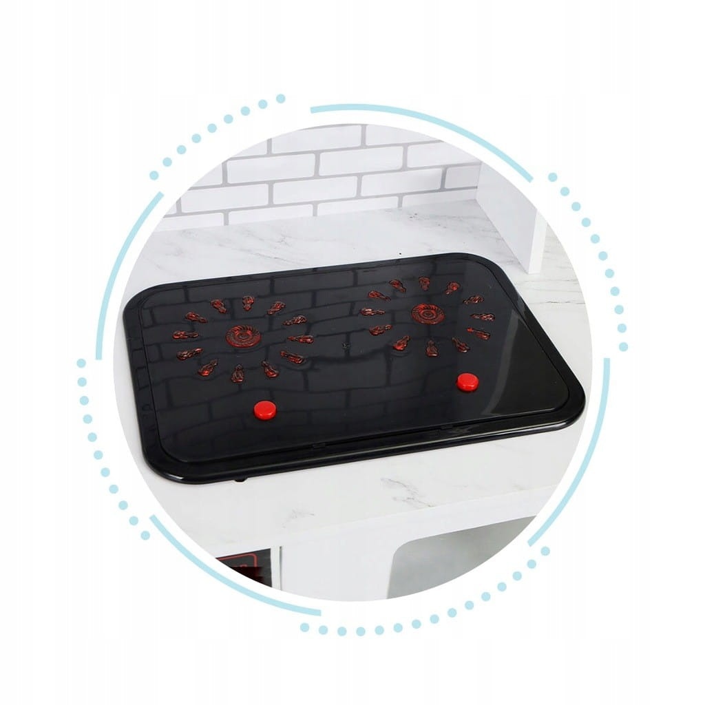 Na blacie kuchni znajdują się dwa palniki podświetlane diodami LED, dodatkowo odtwarzany jest dźwięk gotowanej wody. Nad palnikami znajduje się okap, który wydaje dźwięk pracującego wentylator a dodatkowo posiada podświetlanie (LED). Dzięki temu zabawa stanie się jeszcze bardziej wciągająca. Pod blatem znajduje się piekarnik oraz mikrofalówka, idealna do podgrzania produktów lub pysznych dań. Dla większej frajdy, na jej panelu znajdują się przyciski uruchamiające dźwięk pracującego urządzenia. Pod mikrofalówką znajduje się półka, dzięki której mały szef kuchni będzie mógł zachować porządek. Kuchnia wyposażona jest również w zlew z kranem. Nad zlewem znajdują się haczyki na akcesoria kuchenne.