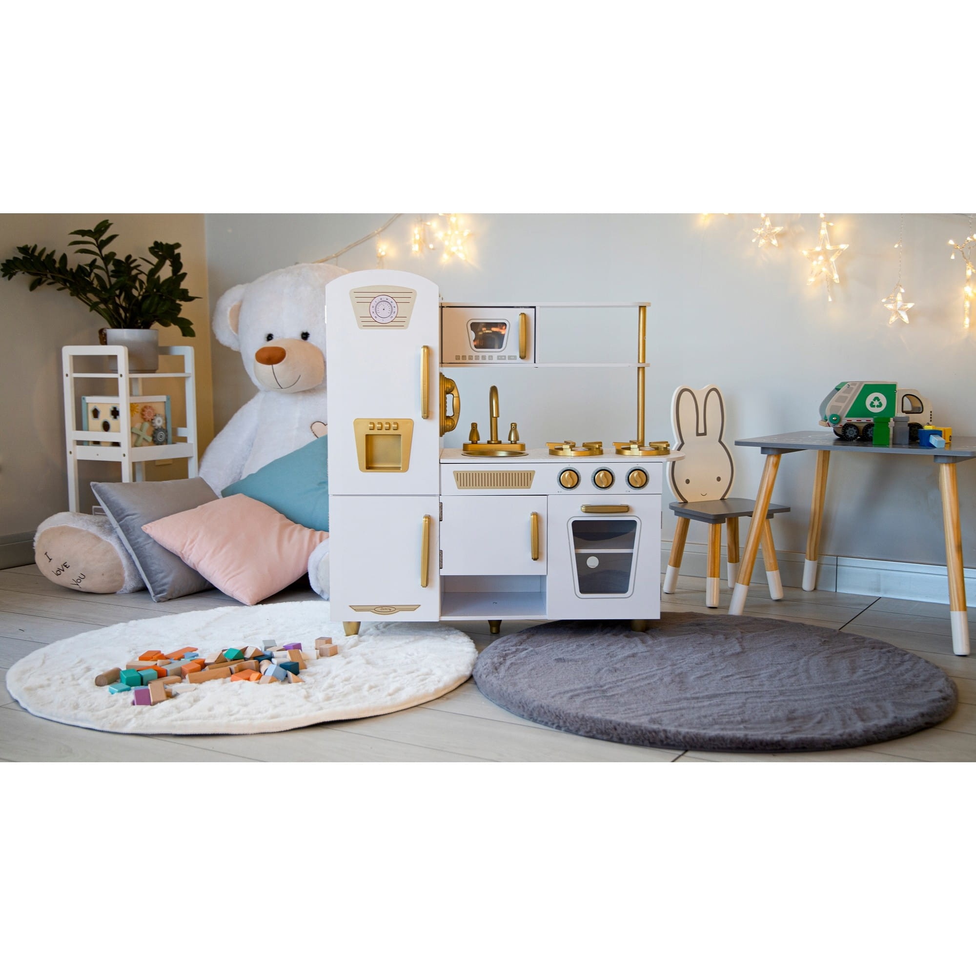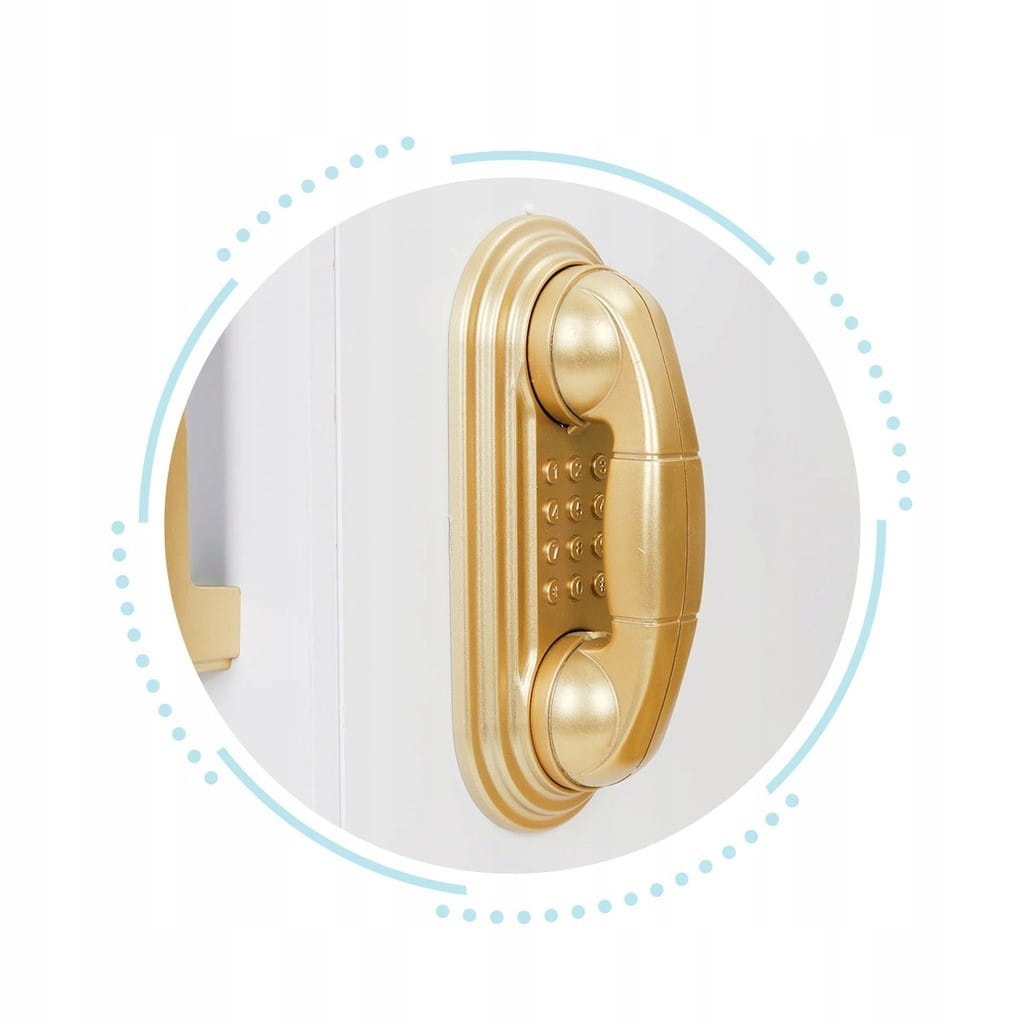 Porządek w kuchni to podstawa a duża ilość szafek tylko pomaga w jego utrzymaniu. Kuchnia wyposażona jest w dwa palniki oraz piekarnik. Klikające pokrętła posłużą do ustawienia odpowiedniej temperatury, a szybka w piekarniku do doglądania pysznego ciasta. Po przygotowaniu potraw Twój mały szef kuchni będzie mógł pozmywać w zlewie z kranem. Dzięki temu, dziecko wyrobi nawyk sprzątania i utrzymywania czystości. Żadna kuchnia nie obejdzie się bez dużej lodówki pełnej różnych pyszności. Twój maluch może do niej odkładać wszystko co mu przyjdzie do głowy. Wbudowany w drzwiach lodówki dozownik do wody/lodu pozwala na jeszcze większe pole do zabaw. Dodatek w postaci wiszącego telefonu pozwoli dzieciom na jeszcze kreatywniejszą zabawę np. w zamawianie brakujących produktów, przyjmowanie zamówień telefonicznych w przypadku zabawy w restaurację czy po prostu pogawędki.