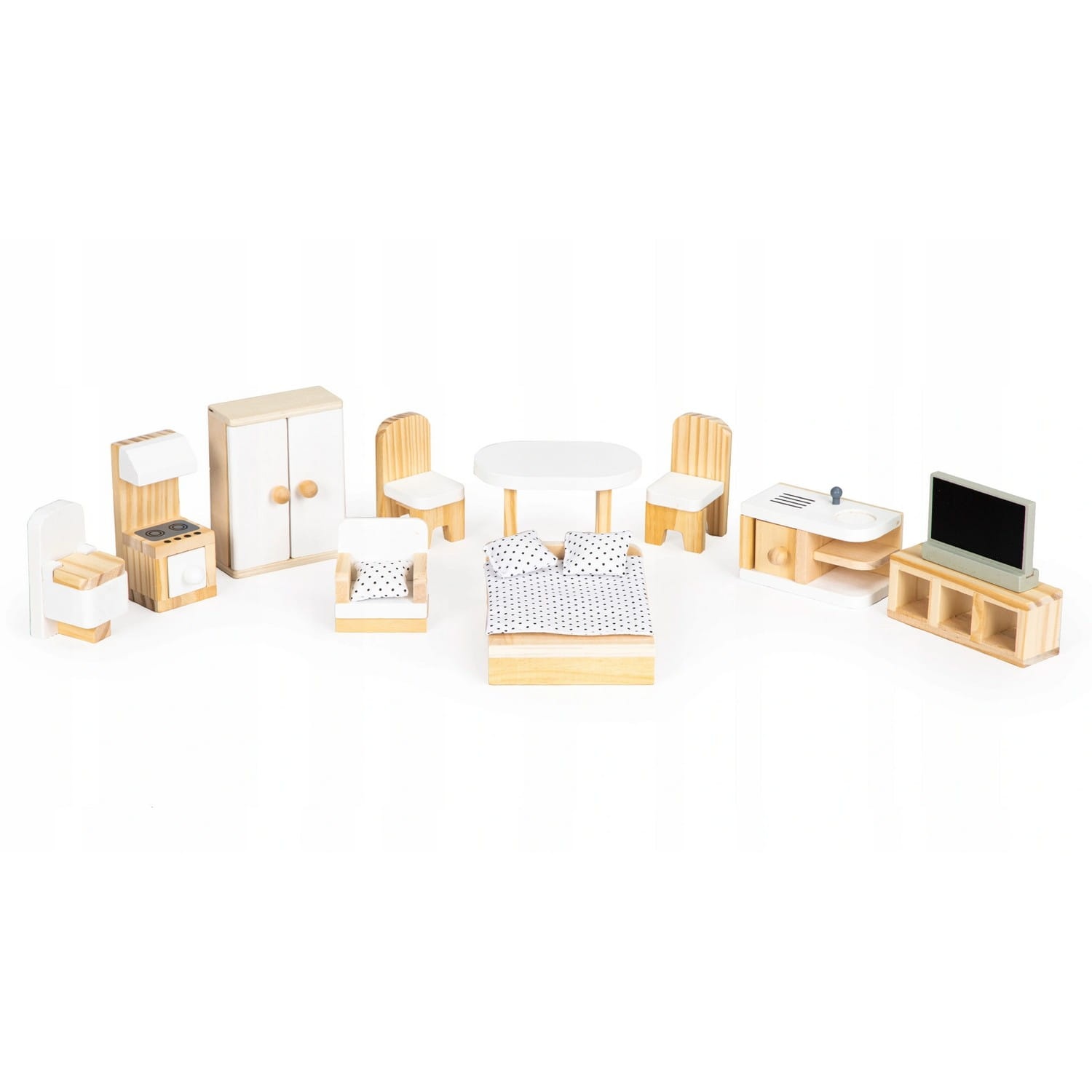 Zestaw obejmuje również komplet 11 drewnianych mebli, w tym szafę, szafkę z telewizorem, fotel, toaletę, łóżko, stół z 2 krzesłami, kuchenkę, szafkę ze zlewozmywakiem. Wszystkie elementy można dowolnie wyjmować i przestawiać bez żadnych ograniczeń.