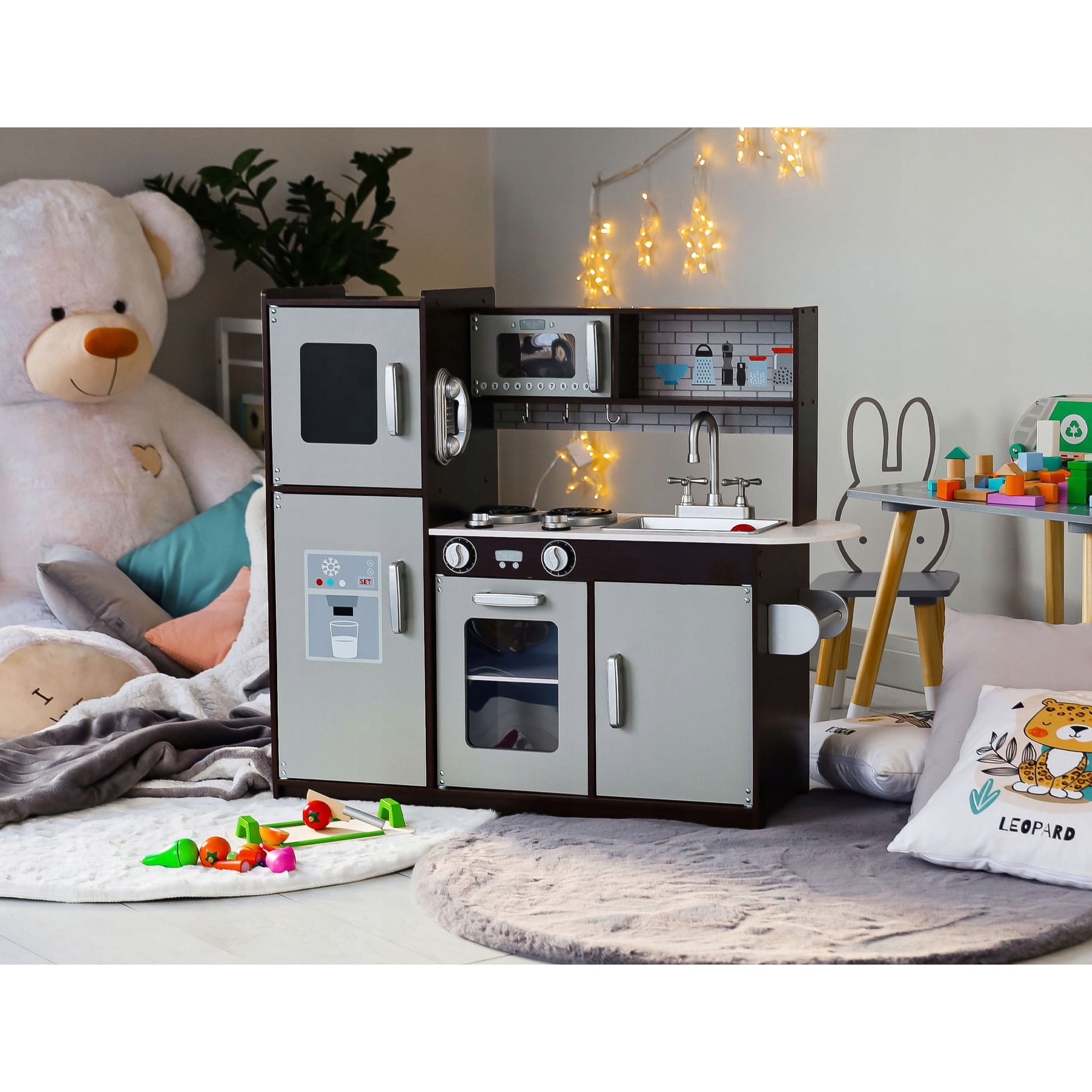Kuchnia marki EcoToys pozwoli dziecku wcielić się w rolę szefa kuchni i przygotować pyszne dania dla całej rodziny czy też dla swoich lalek i misiów. Zabawka posiada wszystkie cechy prawdziwej kuchni co sprawia, że zabawa staje się jeszcze bardziej wciągająca. Porządek w kuchni to podstawa, a zamykane szafki pomogą w jego utrzymaniu. Na blacie umieszczono zlew oraz kran z obracającymi się kurkami dzięki czemu Twój mały kucharz będzie mógł "pozmywać" po skończonym gotowaniu. Kuchnia wyposażona jest w dwa palniki a obrotowe pokrętła klikają podczas ich używania. Na prawym boku kuchni, tuż pod blatem znajduje się funkcjonalny drążek, na którym można odwiesić ręcznik lub inne akcesoria. Na zewnętrznej ścianie lodówki umieszczono zabawkowy telefon.
