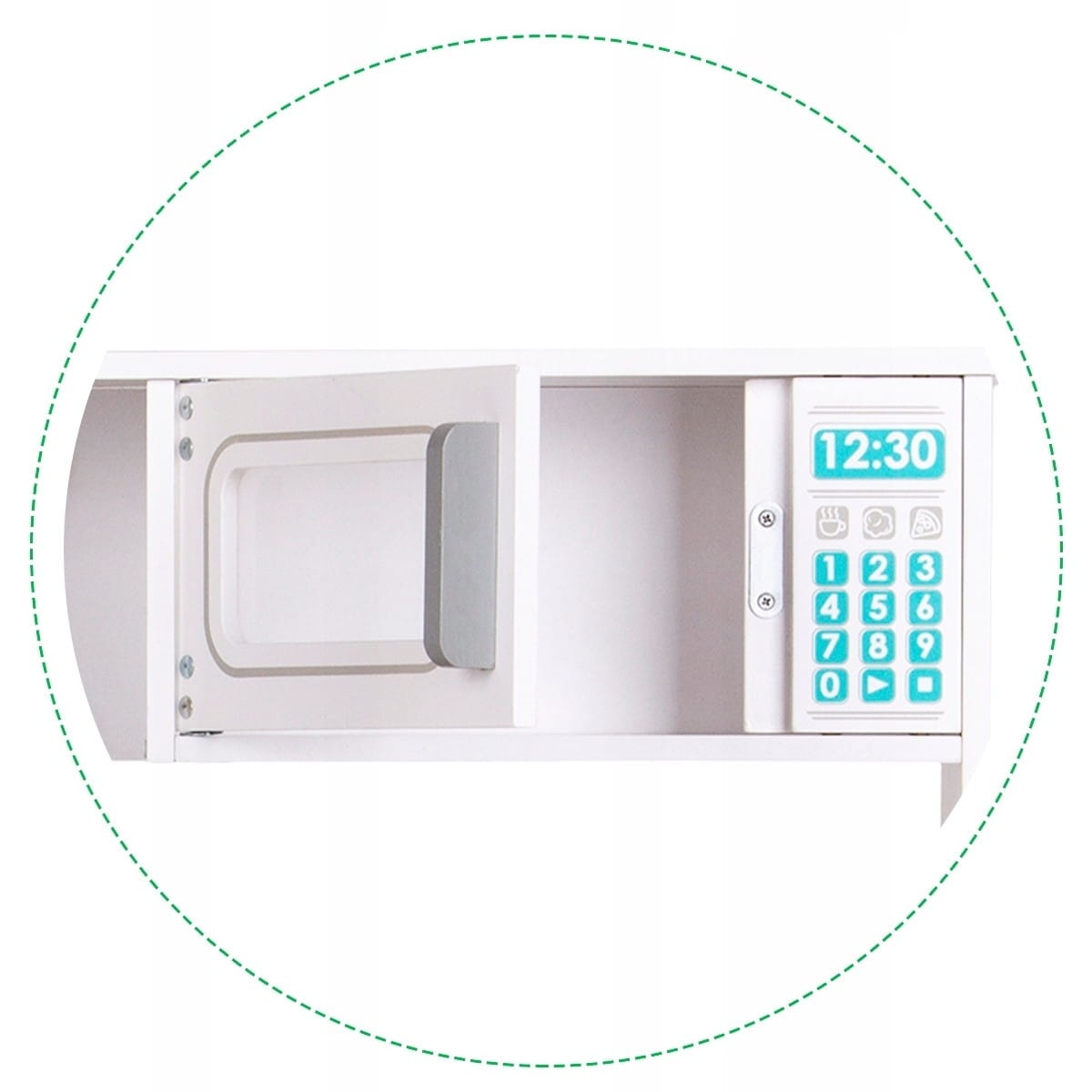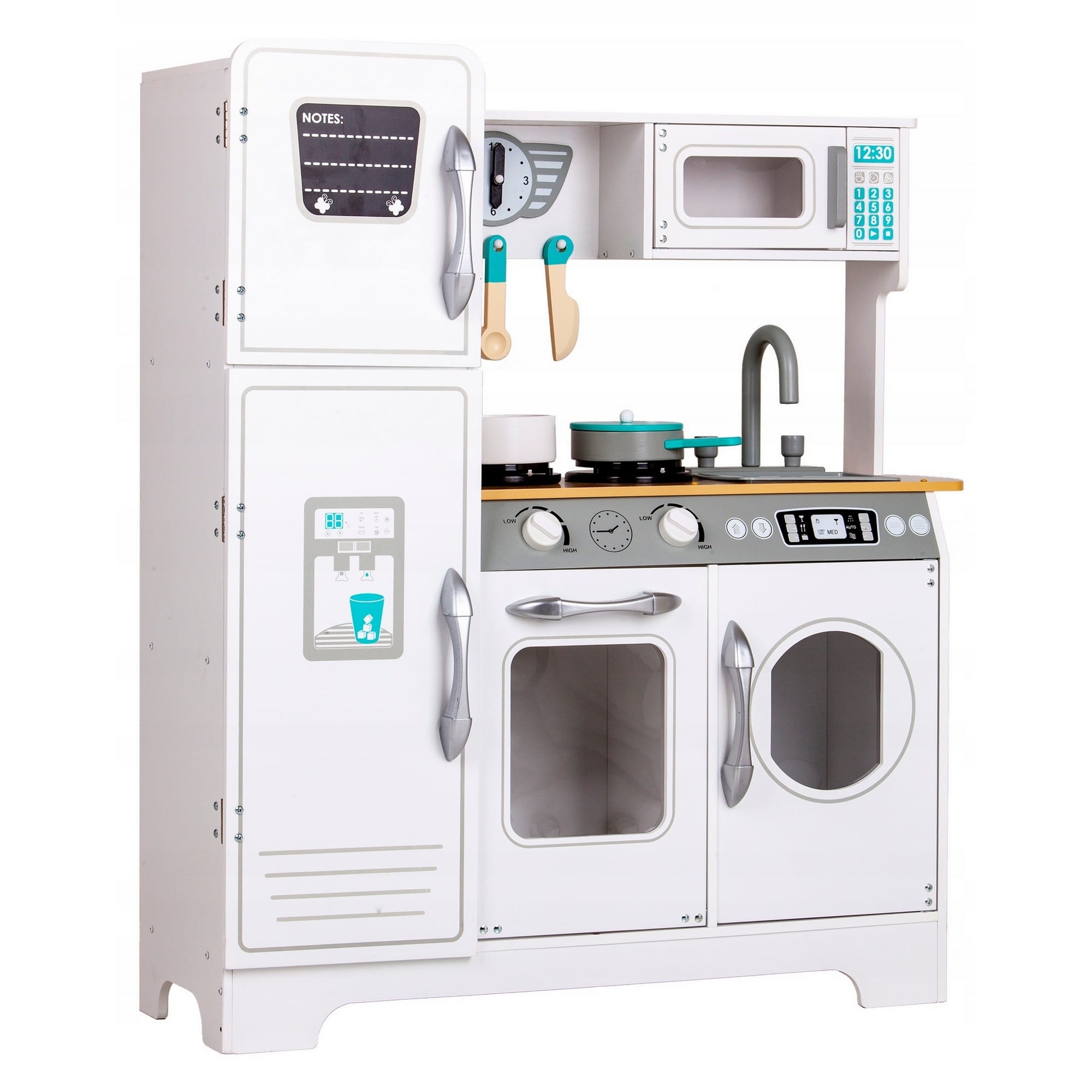 Kuchnia marki EcoToys pozwoli dziecku wcielić się w rolę szefa kuchni i przygotować pyszne dania dla całej rodziny czy też dla swoich lalek i misiów. Zabawka posiada wszystkie cechy prawdziwej kuchni co sprawia, że zabawa staje się jeszcze bardziej wciągająca. Porządek w kuchni to podstawa, a duża ilość szafek tylko pomaga w jego utrzymaniu. Kuchenka została wyposażona w 2 palniki oraz w 2 pokrętła do palników i piekarnika, które po przekręceniu wydają charakterystyczny dźwięk pstrykania. Duże otwierana lodówka przyda się do przechowywania produktów potrzebnych do przygotowania najsmaczniejszych posiłków. W lodówce znajduję się półeczka, dlatego jest tam mnóstwo miejsca na akcesoria do gotowania. W górnej szafce powinny znaleźć się najpotrzebniejsze dodatki takie jak drewniane sztućce oraz garnki, które są potrzebne do przyrządzania posiłków. Mały kucharz musi zadbać aby jego potrawy były ciepłe i smaczne, dlatego w każdym momencie może podgrzać je w zabawkowej mikrofali. Po skończonym gotowaniu wszystkie naczynia można umyć w pojemnym zlewie i odstawić przybory na swoje miejsca. Kuchenka pozwala na zabawę nie tylko w zakresie gotowania i przygotowania posiłków. Pralka, która znajduję się obok piekarnika zapewni zabawę w pranie ubrań. To doskonały krok aby nauczyć dziecko samodzielności i odpowiedzialności w codziennych obowiązkach. Dodatkowo w kuchni zadbano o detale takie jak haczyki na drewniane sztućce, dzięki czemu zawsze będą pod ręką. W zestawie znajduje się 6 akcesoriów kuchennych: garnek, patelnia, pokrywka, łyżka, łopatka, noż. Wszystkie elementy są wykonane z drewna i pokryte bezpieczną dla dzieci farbą.