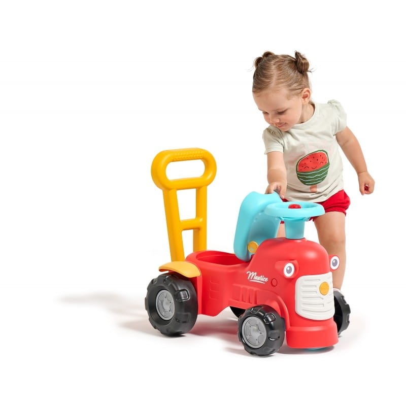 Maurice to uroczy traktorek bez pedałów francuskiej marki Falk, który będzie towarzyszem pierwszych kroków Twojego dziecka. Jasne kolory i zaokrąglone kształty zachwycą każdego malucha. Uruchamianie traktora za pomocą małego pokrętła dźwiękowego oraz dźwięk z klaksonu umieszczonego na kierownicy to wspaniała pierwsza nauka, która pobudzi umiejętności motoryczne i słuch Twojego dziecka. Jeżdżąc na jeździku, bawiąc się kierownicą z klaksonem i skrętnymi kołami dziecko będzie ćwiczyło koordynację i równowagę. Stojąc z tyłu, może korzystać z ergonomicznego oparcia, aby uczyć się chodzić przez zabawę, bez strachu i całkowicie bezpiecznie. Pod siedzeniem znajduje się niewielki schowek do przechowywania skarbów.