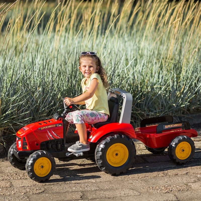 Czerwony traktor na pedały z przyczepą Supercharger marki FALK to spełnienie marzeń niejednego małego traktorzysty. Starannie wykonany, z dbałością o najmniejszy szczegół! Żaden Farmer by takim nie pogardził. Pojazd wykonany z najwyższej jakości tworzywa przeznaczony dla dzieci w wieku od 3 lat. Traktor jest wyposażony w odpinaną przyczepę oraz kierownicę z klaksonem. Traktor posiada również otwieraną maskę z imitacją prawdziwego silnika. Koła traktorka zostały wykonane z wysokiej jakości plastiku.