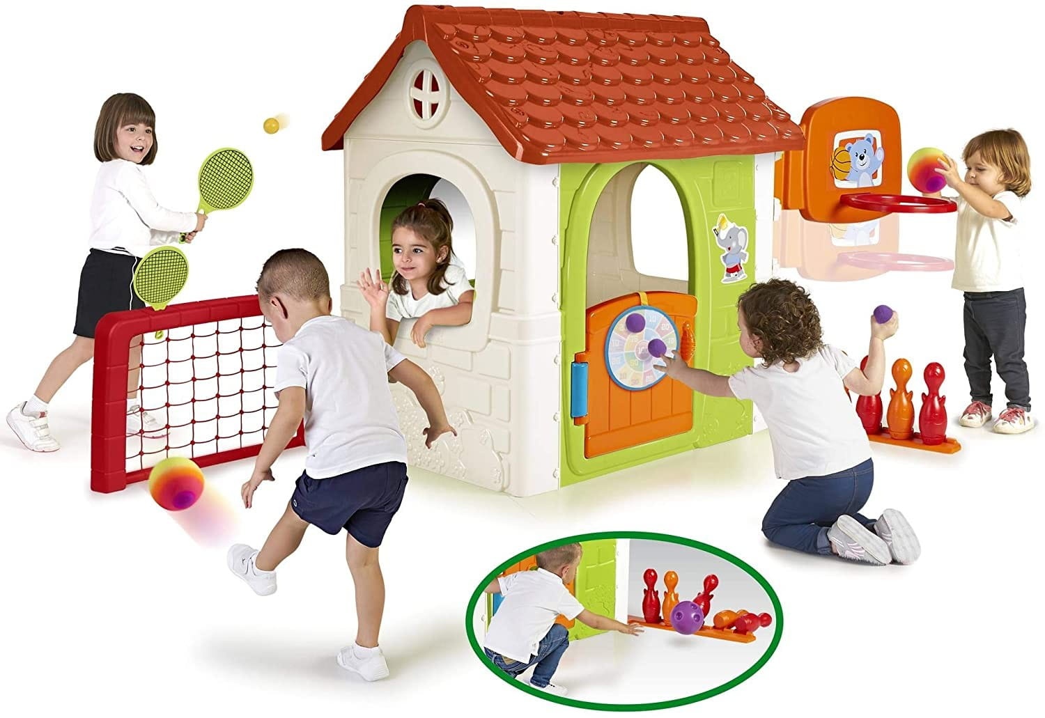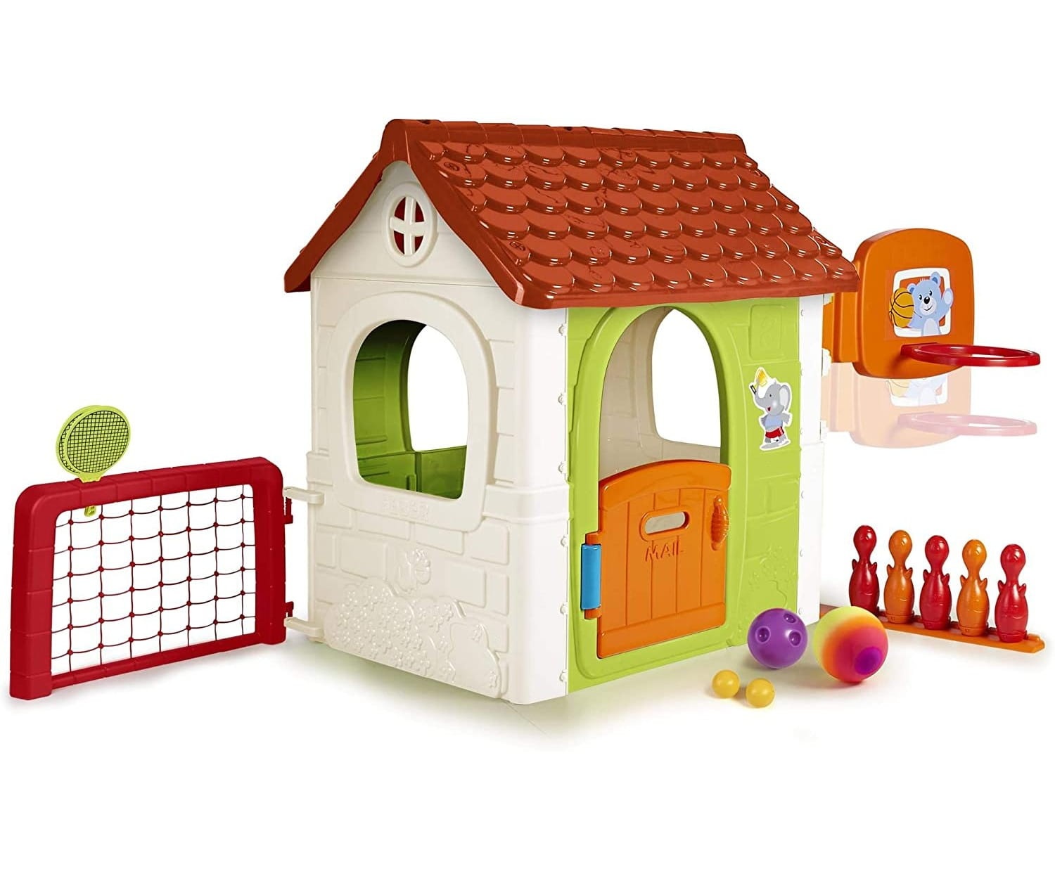 Domek ogrodowy Feber to prawdziwe centrum rozrywki dla najmłodszych! Zestaw składa się z domku, kręgli, bramki z piłką do gry w piłkę nożną, koszykówki, rakietek oraz tarczy z piłkami na rzepy. Jest tyle możliwości zabawy, że dzieci z całą pewnością szybko się nie znudzą zabawą. Po skończonej zabawie łatwo jest złożyć wszystkie elementy do gier, tak by domek z akcesoriami zajmował mniej miejsca.