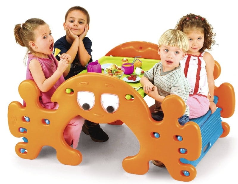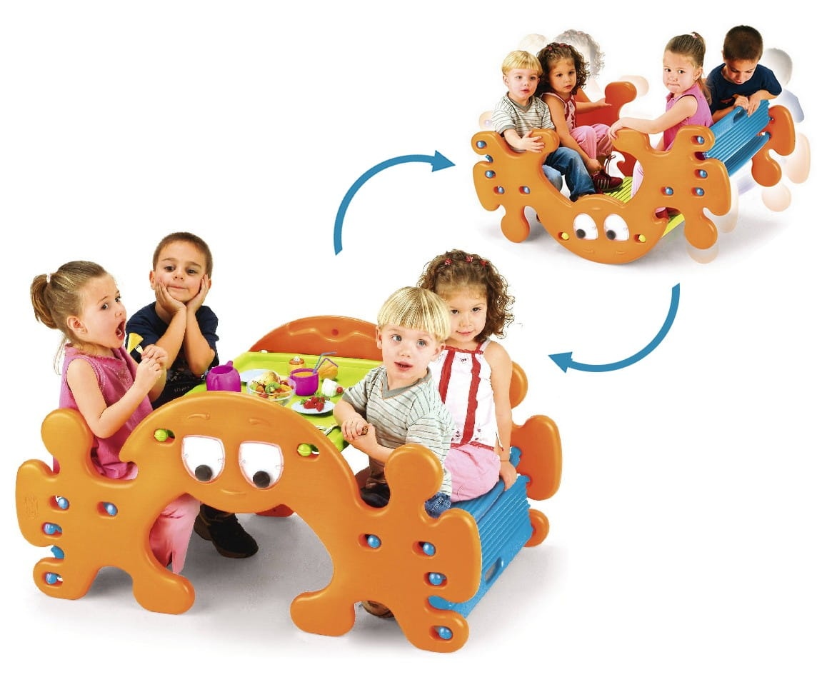 Stolik - bujak z ruchomymi oczami firmy Feber to doskonałe uzupełnienie przydomowego placu zabaw. Stabilny stolik piknikowy po obróceniu staje się świetną huśtawką - bujakiem. Zabawka posiada 4 wygodne miejsca do siedzenia.