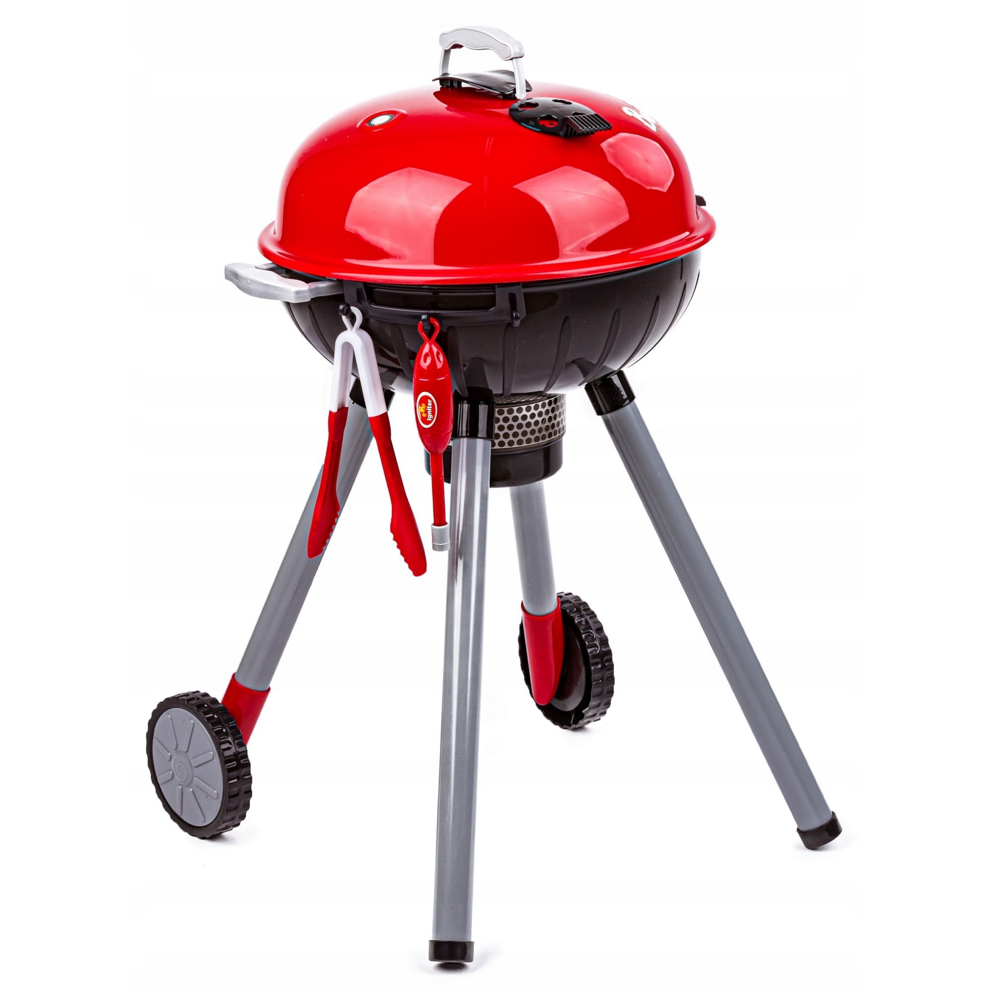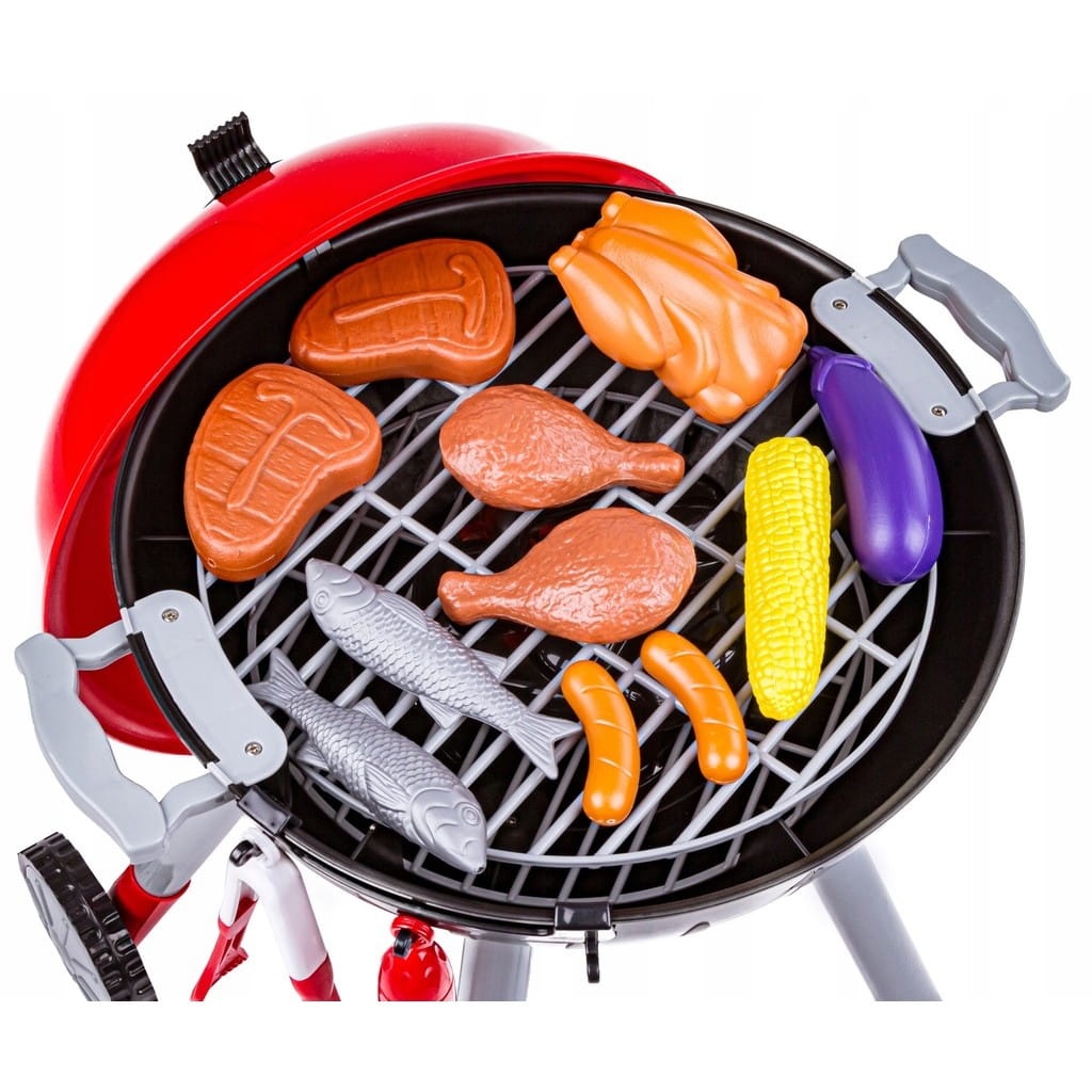 Grill z kółeczkami i pokrywą wykonany jest w czerwono-czarnej kolorystyce i posiada mnóstwo akcesoriów, które sprawiają, że zabawa jest jeszcze bardziej realistyczna. Dzieci mogą naśladować swoich rodziców podczas urządzania grilla w całkowicie bezpieczny, umożliwiający swobodną zabawę sposób.