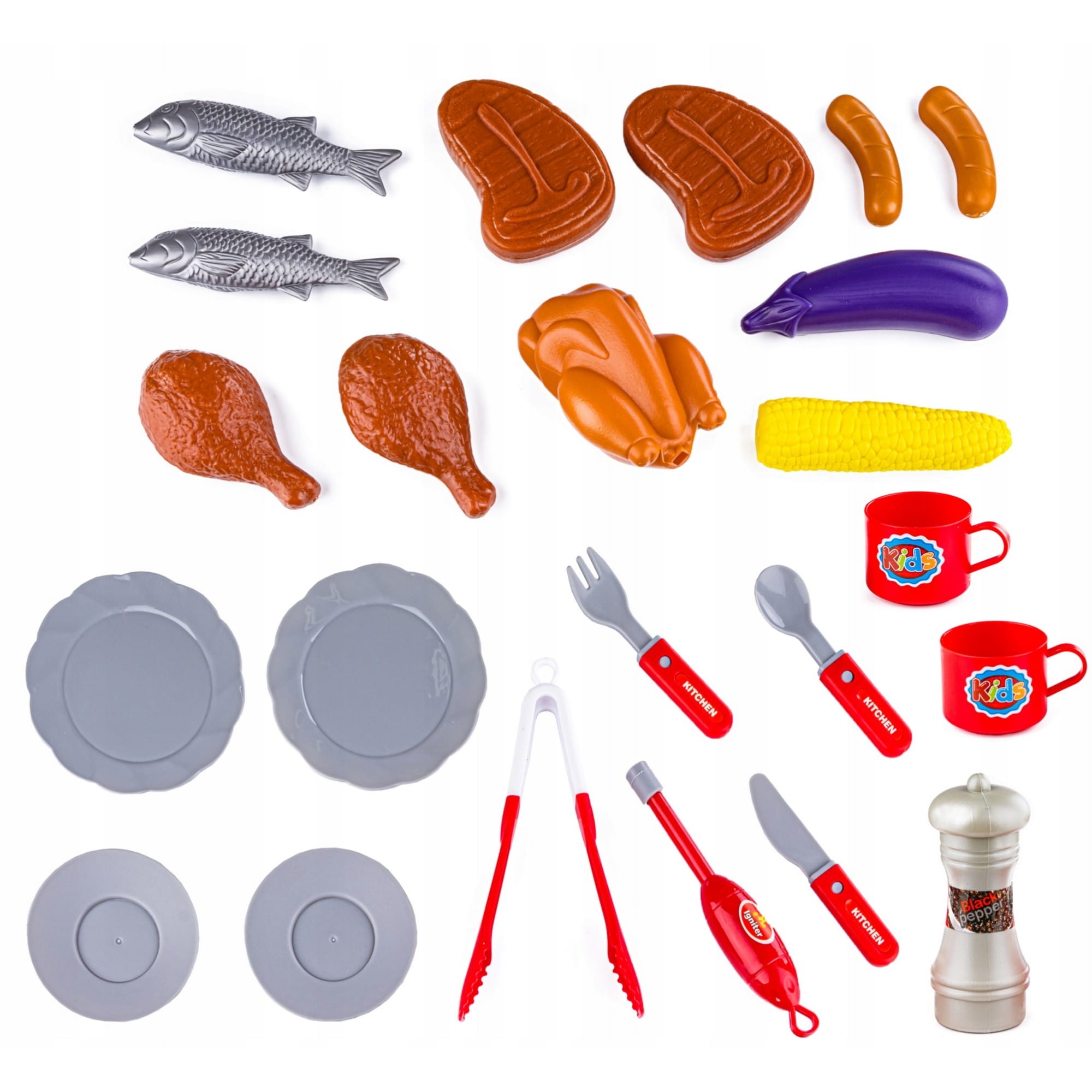 Zestaw do grillowania zawiera niemal wszystko, co jest niezbędne do przyrządzenia przepysznych dań. Do dyspozycji małej gospodyni / gospodarza jest cała gama naczyń, sztućców oraz sporo jedzenia. Znajdziemy tu oczywiście mięsko m.in. udka z kurczaka czy standardowe kiełbaski ale nie zapomniano również o warzywach jak choćby bakłażanie czy kolbie kukurydzy.