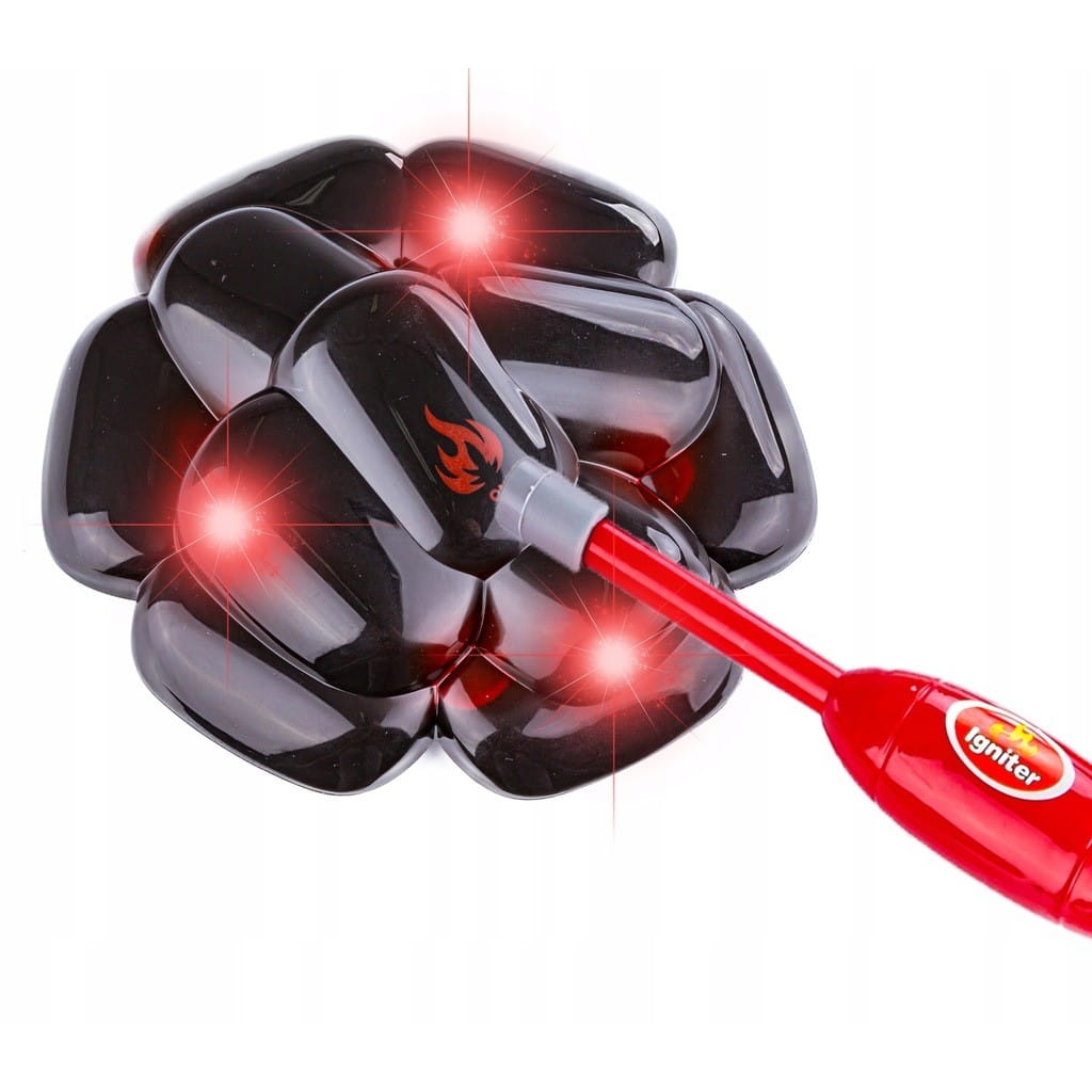 Grill nie tylko wygląda jak prawdziwy, ale również wydaje dźwięki jak prawdziwy. Do elementu imitującego węgiel drzewny wkładamy baterie (3 x AAA - brak w zestawie). Zapalarkę przykładamy do węgla i od razu usłyszymy dźwięk grillowanych, skwierczących potraw. Po takim rozpaleniu pojawiają się również światełka imitujące płomienie.