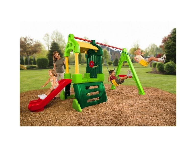 Wspaniały,  wielofunkcyjny plac zabaw firmy Little Tikes składa się z 2 wygodnych huśtawek, zjeżdżalni o długości ślizgu 110 cm, ścianki i drabinki z lin do wspinania oraz zadaszonego balkoniku do zabaw. Na ściance balkonu umieszczona jest kierownica - ster dla małego kapitana.
