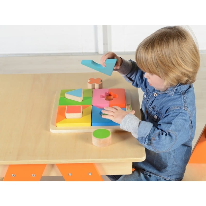Drewniana kolorowa układanka jest genialną zabawką dla maluchów, które lubią wyzwania. Ich zadaniem jest ułożenie puzzli składających się z 12 elementów o różnych rozmiarach, kolorach i kształtach. Drewniana tablica podpowiada w jaki sposób należy układać, ale od dziecka wymagane jest skupienie i logiczne myślenie. Układanka posiada cztery podstawowe kształty, których może nauczyć się dziecko podczas zabawy, oraz kolorowe ramki dla każdego z nich, które również należy ułożyć z puzzli.