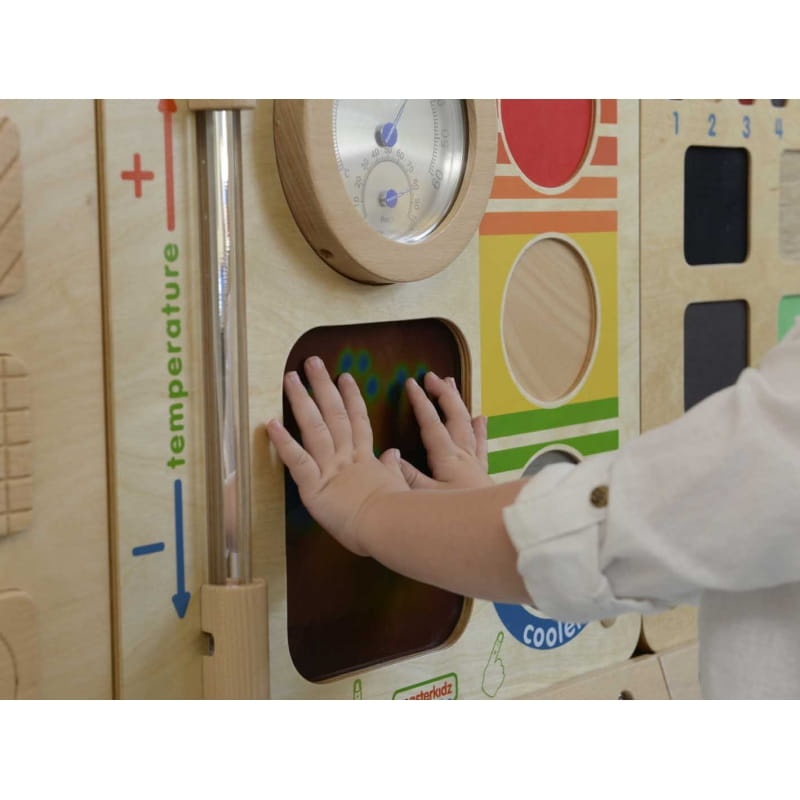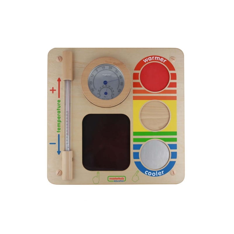 Fantastyczna tablica edukacyjna, dzięki której dziecko może nauczyć się o temperaturach. Na tablicy mamy kilka pól: ciepłe, neutralne, zimne, oraz tablicę ciepłoczułą, na której widzimy odciski ciepłej dłoni. Na tablicy znajduje się również termometr.