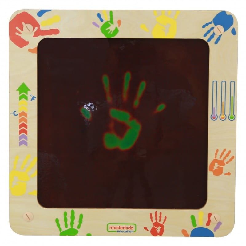Tablica edukacyjna reagująca na ciepło ma ciemną specjalną folię z tworzywa sztucznego dopasowaną do jej powierzchni. Kiedy dzieci położą na niej ciepłe dłonie i ją zdejmą, odkryją, że pojawił się kolorowy nadruk dłoni. Im gorętsze dłonie, tym wyraźniejsze odbicie.