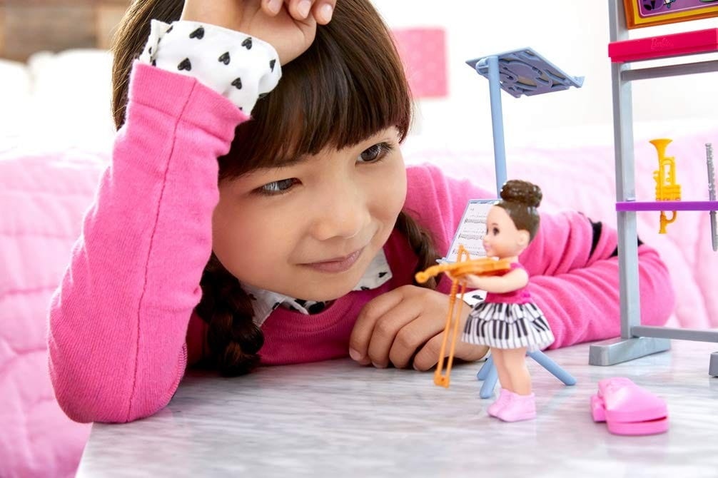 W zestawie znajduje się lalka Barbie, mała laleczka - uczennica (ok. 8 cm), stojak z nutami, tablica, duże skrzypce dla nauczycielki, małe skrzypce dla uczennicy, trąbka, flet itp.