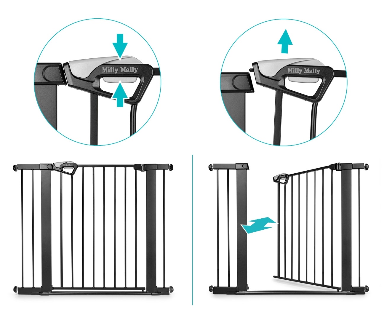 Bramka została wyposażona w podwójny system zabezpieczenia, który uniemożliwia dziecku samodzielne otwarcie. Odpowiednio zaprojektowane zawiasy oraz bezpieczne krawędzie minimalizują ryzyko urazów, w tym przytrzaśnięcia palców. Otwieranie w obu kierunkach zwiększa wygodę użytkowania, niezależnie od strony montażu.