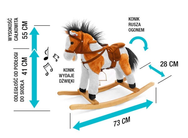 Koń na biegunach Łatek to wyjątkowa zabawka, o której marzy niejedno dziecko. Konik oprócz tradycyjnej funkcji bujania posiada wiele dodatkowych atrakcji, które umilą dziecku zabawę. Konik został wykonany z miękkiego pluszu, posiada drewniane bujaki oraz drewniane uchwyty.