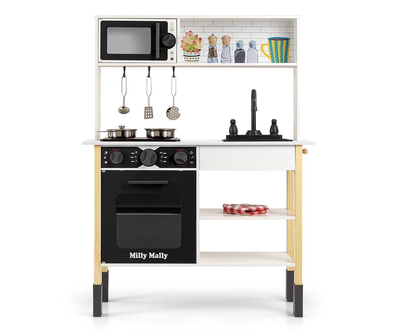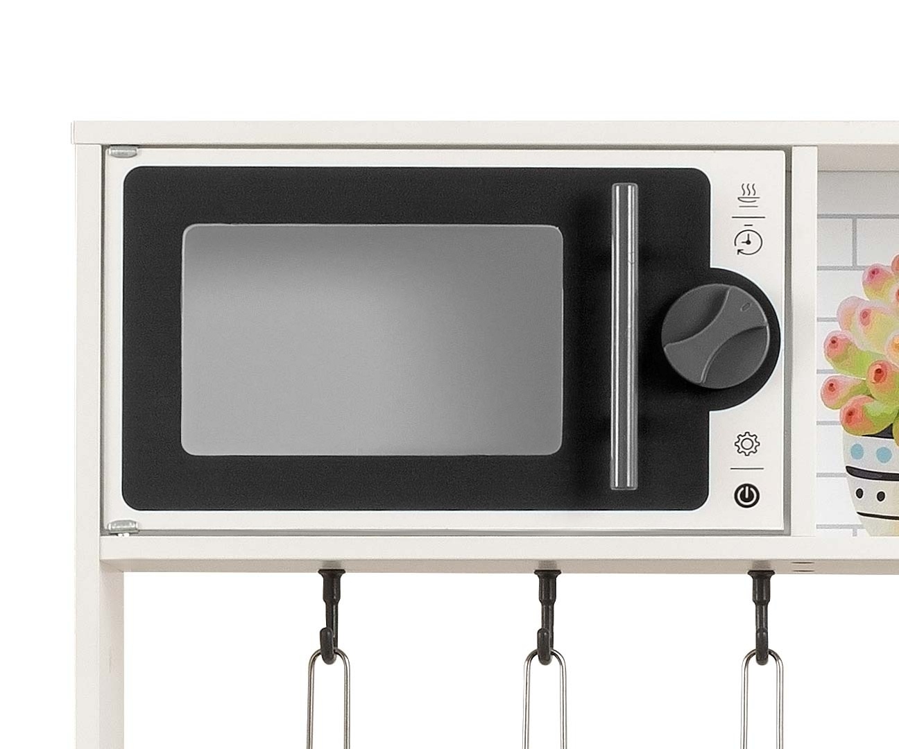 Nad płytą umieszczono trzy haczyki na akcesoria kuchenne, a powyżej – mikrofalówkę z otwieranymi drzwiami, okienkiem z pleksi i klikającym pokrętłem, dzięki czemu dziecko może obserwować umieszczone w niej „potrawy”. Nad zlewem znajduje się także praktyczna półka.