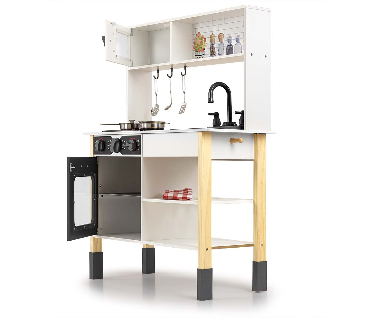 W zestawie znajduje się bogate wyposażenie kuchenne: garnek z pokrywką, patelnia oraz stalowe akcesoria – łopatka, czerpak i łyżka cedzakowa, które można zawiesić na haczykach. Dodatkowo kuchnia posiada ściereczkę kuchenną oraz dedykowany drewniany haczyk. Schowki i półki są na tyle pojemne, aby dziecko mogło przechowywać własne zabawkowe produkty, ucząc się porządku i odpowiedzialności.