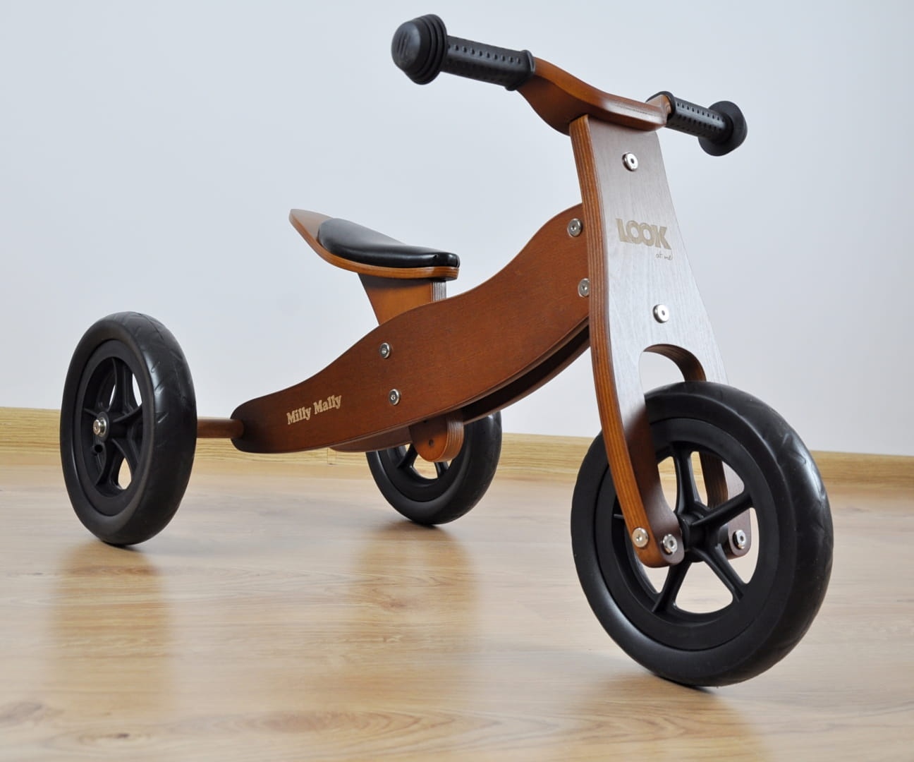 Rowerek biegowy Look firmy Milly Mally to idealne rozwiązanie dla maluszków, które dopiero rozpoczynają swoją przygodę z rowerkami i chciałyby się już samodzielnie przemieszczać, ale jeszcze nie potrafią utrzymać równowagi na dwóch kółkach. Trzy piankowe koła zapewniają stabilność, bezpieczeństwo i komfort jazdy zarówno w domu, jak i na zewnątrz a lekka i jednocześnie wytrzymała konstrukcja sprawdzi się w każdych warunkach. Niewątpliwą zaletą tego rowerka jest możliwość przerobienia go z rowerka (pojazdu) trójkołowego na dwukołowy rowerek biegowy. Dzięki temu Wasze dziecko będzie mogło dłużej się cieszyć z użytkowania tego niezwykłego rowerka, który będzie „rósł” wraz z nim.  Miękkie antypoślizgowe rękojeści z osłonkami zapewnią ochronę dłoni dziecka, a regulowana wysokość siodełka pozwoli dostosować odpowiednią wysokość do wzrostu dziecka. Rowerek posiada również ogranicznik skrętu, po to by dziecko nie wykręciło kierownicy uniemożliwiając sobie jazdę.