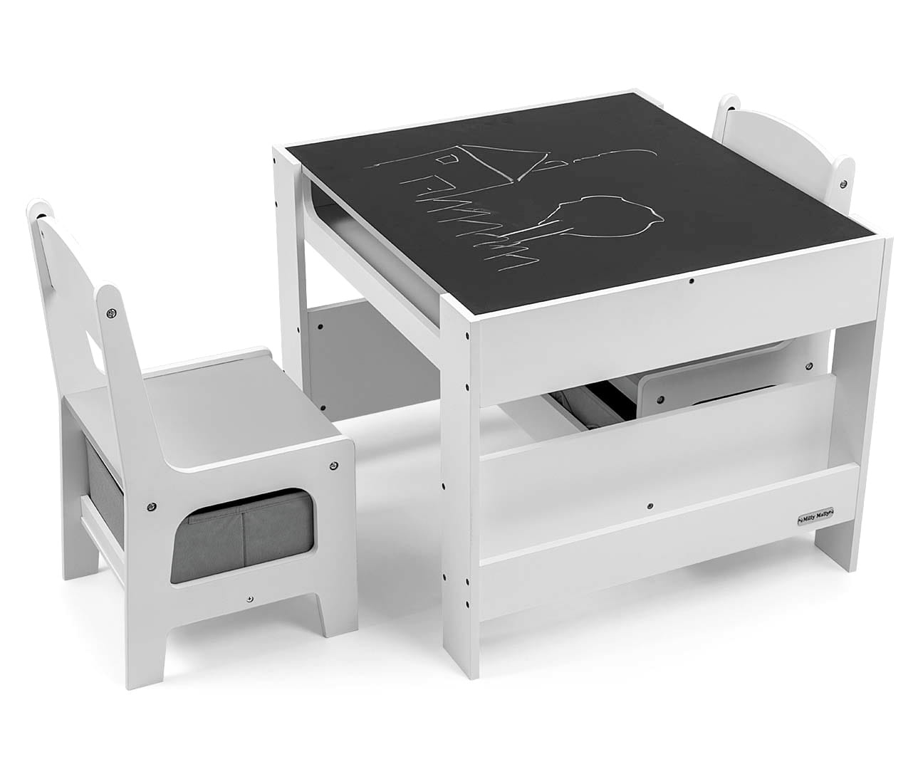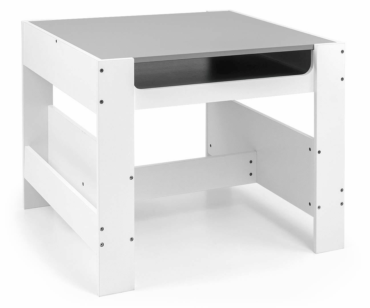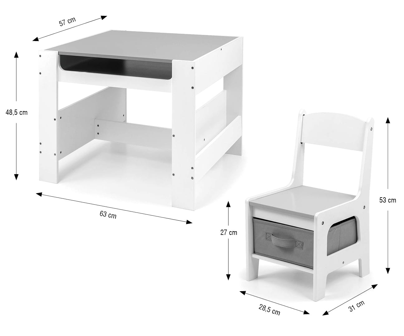 Jednym z najważniejszych atutów zestawu SVEN jest dwustronny blat stolika. Z jednej strony pełni funkcję klasycznej powierzchni do pisania i rysowania, a z drugiej to tablica kredowa, na której dzieci mogą tworzyć swoje arcydzieła. Dodatkowo, duży schowek pod blatem pozwala na przechowywanie przyborów plastycznych, zabawek czy książeczek, co wspiera utrzymanie porządku w pokoju malucha.