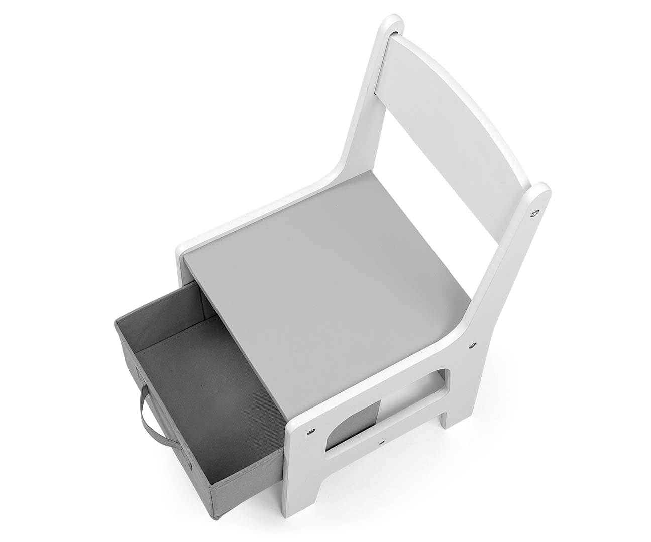 Dzięki bocznym półkom, dzieci mają łatwy dostęp do swoich skarbów, takich jak książeczki, zeszyty czy kredki. Dwa tekstylne przyborniki, schowane pod krzesełkami, oferują dodatkowe miejsce na przechowywanie drobiazgów, co sprzyja organizacji przestrzeni i uczy dzieci dbania o swoje rzeczy.
