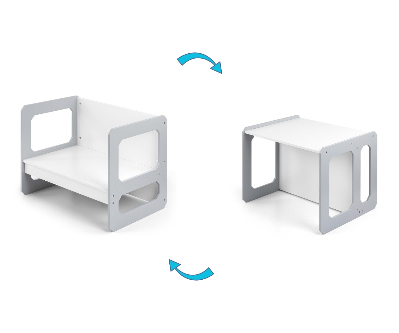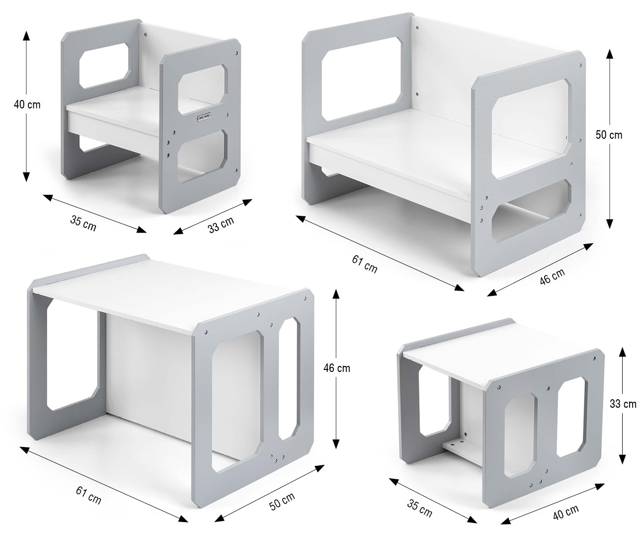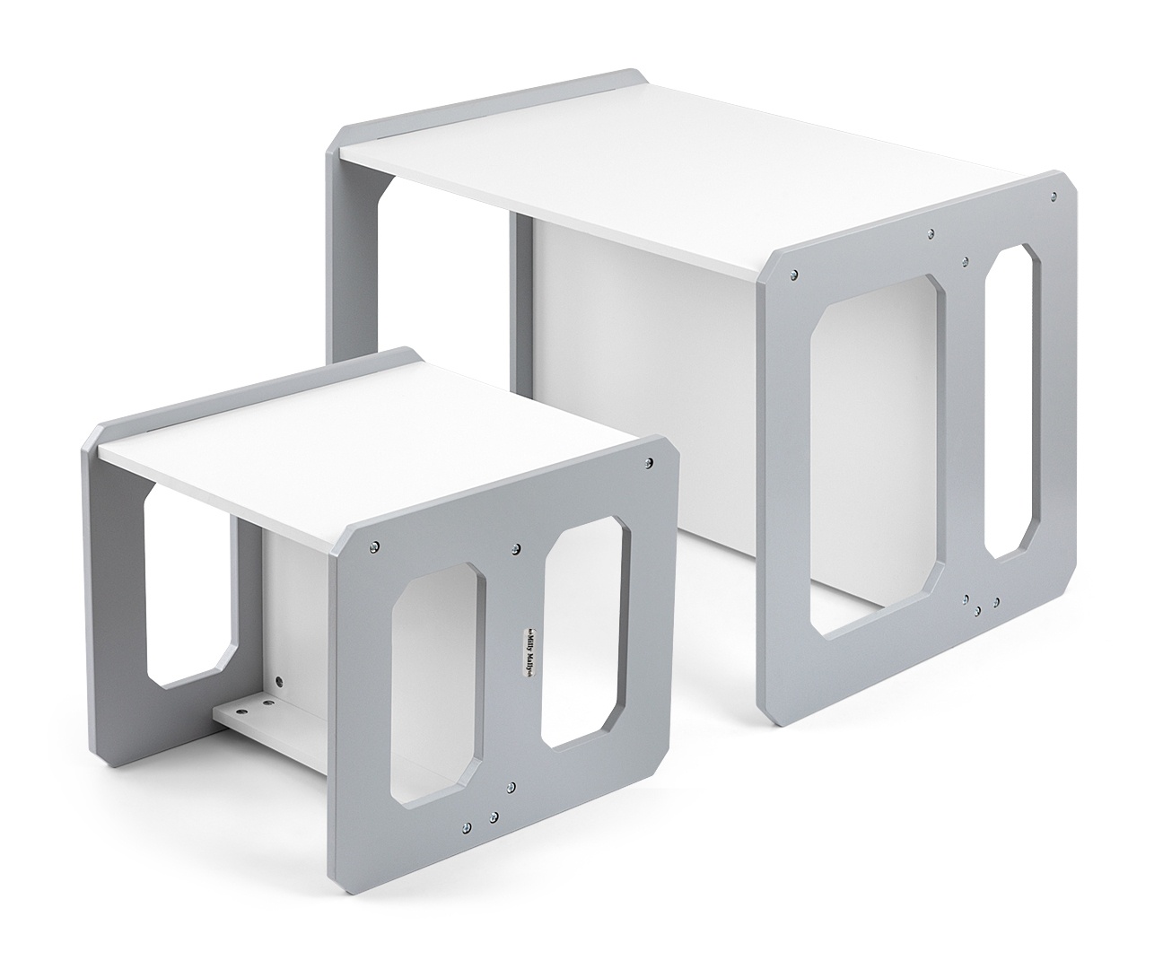 Stolik może zostać odwrócony i wykorzystany jako większe siedzisko, natomiast krzesełko sprawdzi się zarówno jako mniejsze siedzisko, jak i niski stolik. Lekka konstrukcja umożliwia łatwe przestawianie mebli, co pozwala dzieciom samodzielnie aranżować swoją przestrzeń do zabawy, rysowania, pisania czy czytania.