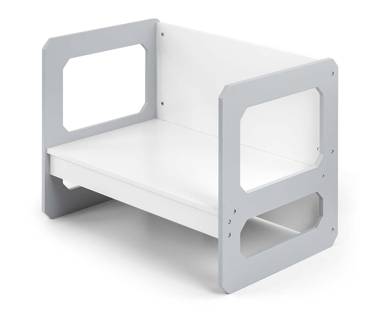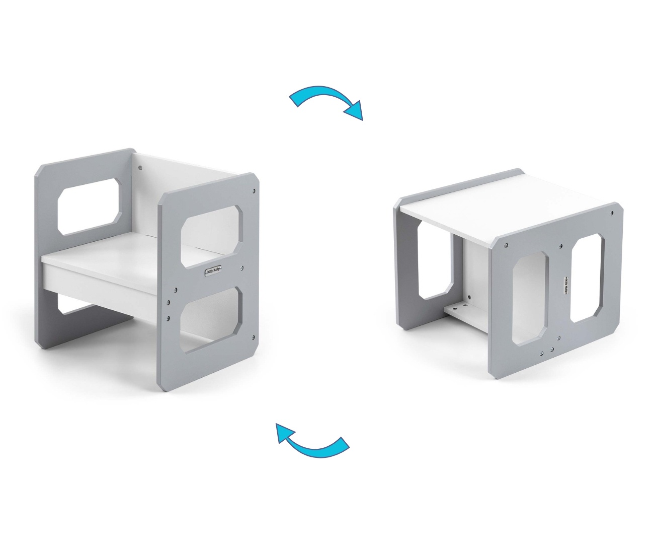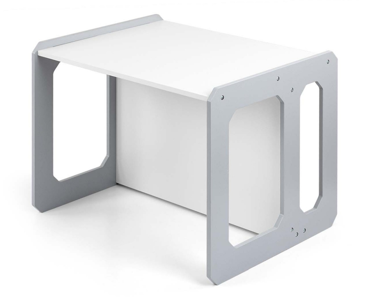 Stolik może zostać odwrócony i wykorzystany jako większe siedzisko, natomiast krzesełko sprawdzi się zarówno jako mniejsze siedzisko, jak i niski stolik. Lekka konstrukcja umożliwia łatwe przestawianie mebli, co pozwala dzieciom samodzielnie aranżować swoją przestrzeń do zabawy, rysowania, pisania czy czytania.