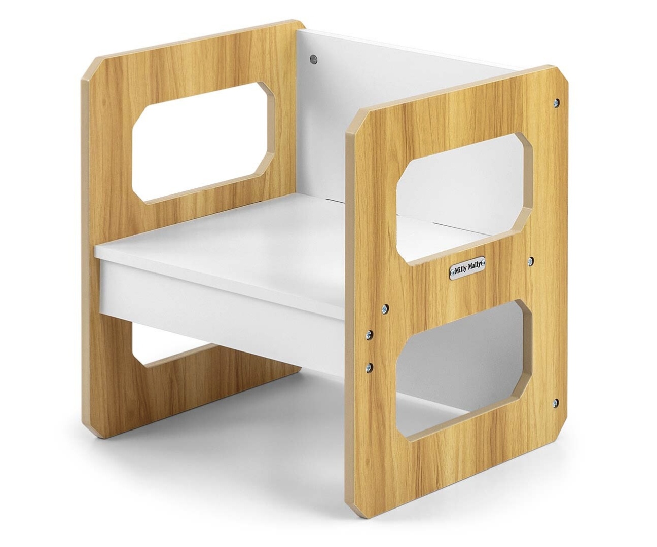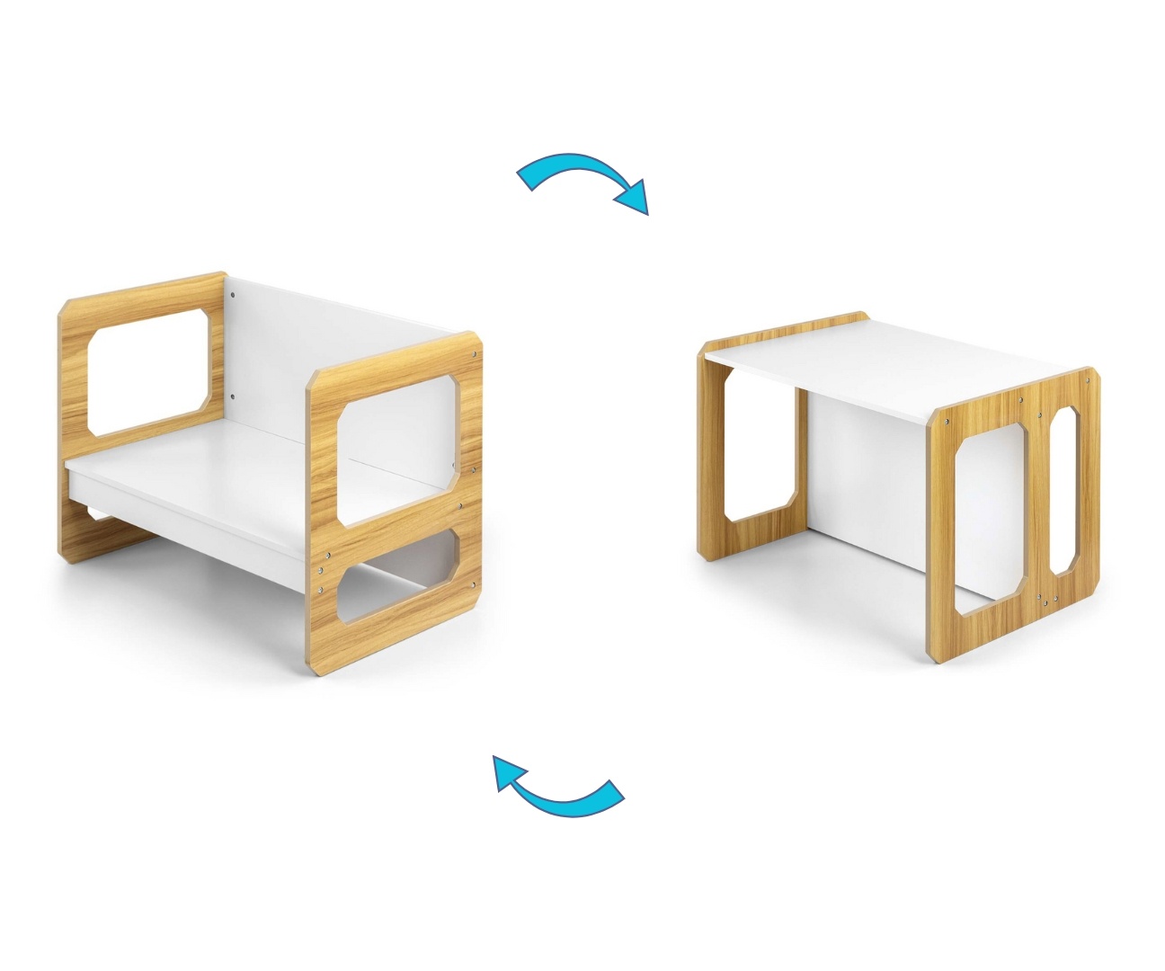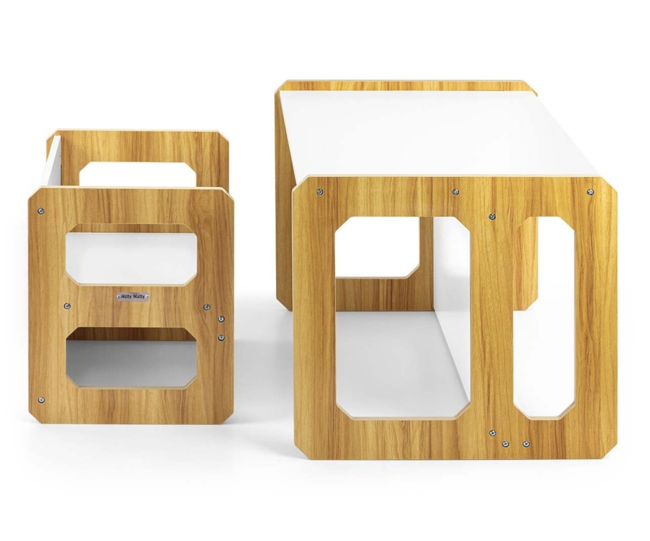 Stolik może zostać odwrócony i wykorzystany jako większe siedzisko, natomiast krzesełko sprawdzi się zarówno jako mniejsze siedzisko, jak i niski stolik. Lekka konstrukcja umożliwia łatwe przestawianie mebli, co pozwala dzieciom samodzielnie aranżować swoją przestrzeń do zabawy, rysowania, pisania czy czytania.