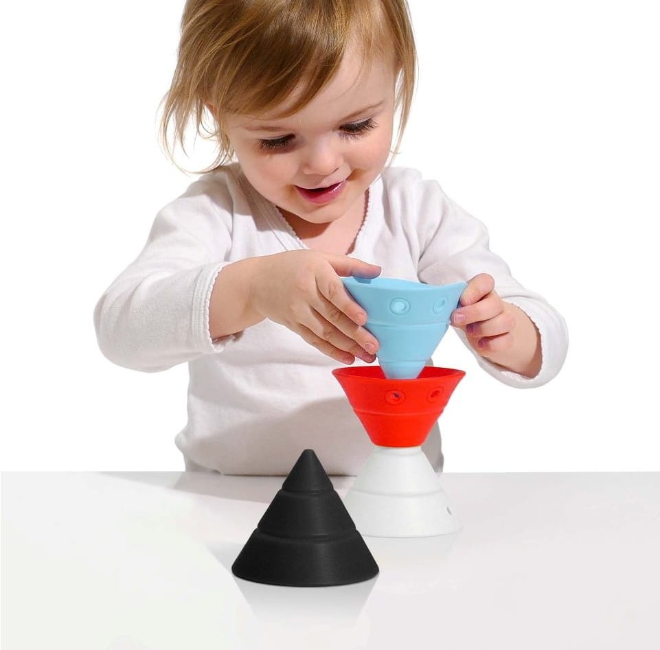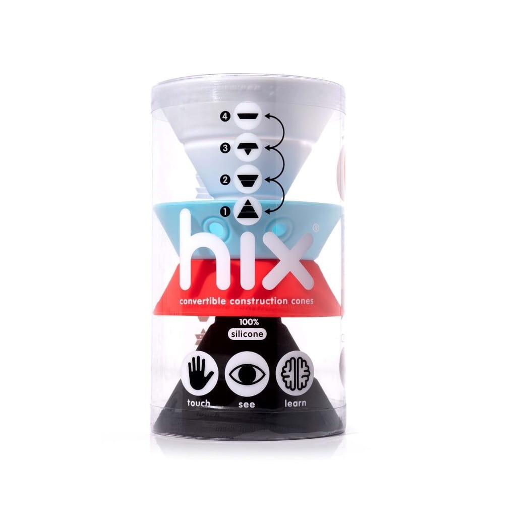 Zestaw czterech pozornie zwykłych silikonowych stożków. Każdy z klocków potrafi przeobrazić się w 4 różne kształty, sprawdź sam ile kombinacji-ustawień uda Ci się ułożyć. Stożki-klocki zostały wykonane z elastycznej gumy silikonowej. Hix poprzez zabawę uczy dzieci konstruować, dodatkowo trenuje zdolność wizualno-przestrzenną, koordynację ręka-oko oraz umiejętności motoryczne. Hix jak wszystkie zabawki marki Moluk, jest z nimi kompatybilny.