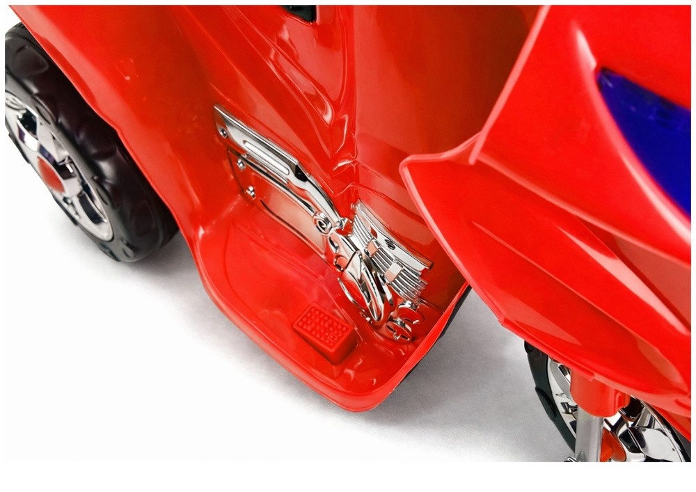 Czerwona wersja akumulatorowego ścigacza przyciąga wzrok zarówno niecodzienną kolorystyką, jak i konstrukcją oraz zdobieniami w formie różnokolorowych, kontrastujących naklejek charakterystycznymi dla pełnowymiarowych pojazdów. Na połyskującym, czerwonym nadwoziu wykonanym z trwałego i solidnego plastiku ABS umieszczono oznaczenia modelu, sprawiające, że pojazd wygląda bardzo nowocześnie i oryginalnie. Doznanie to podnosi imitacja chromowanych elementów przypominających układ wydechowy, co z pewnością zrobi wrażenie na każdym dziecku. Wysoce istotnym rozwiązaniem jest także trzykołowa konstrukcja, ułatwiająca prowadzenie pojazdu dzieciom mającym problem z utrzymaniem równowagi podczas jazdy. Zabawa jeszcze nigdy nie była tak prosta!