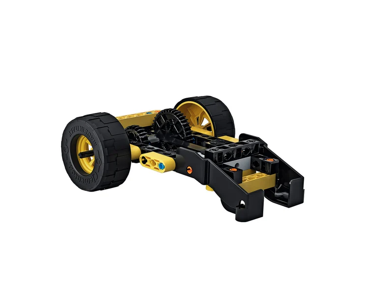 Czerpak buldożera podnosi się dzięki mechanizmowi przekładni ślimakowej, a skręcenie kierownicy pozwala zmieniać kierunek jazdy, co uczy dzieci podstaw mechaniki i ruchu pojazdów.