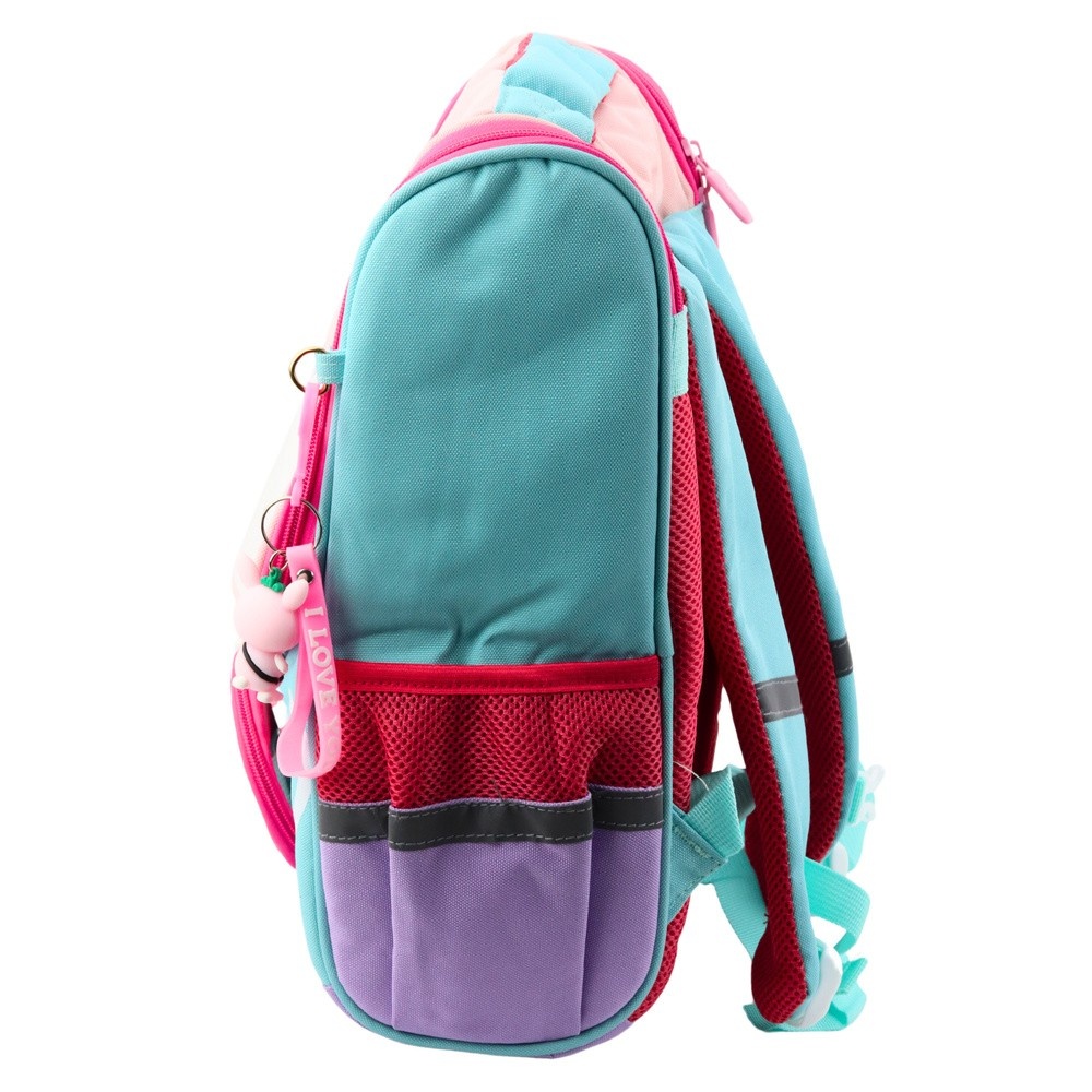 Plecak posiada jedną dużą komorę główną, która zapewnia wystarczająco dużo miejsca na książki, zeszyty i inne akcesoria szkolne. Z przodu znajduje się odpinana saszetka z ptaszkiem, którą można wykorzystać jako osobne etui lub ozdobę. Dodatkowo do suwaka przypięta jest zawieszka z uroczym króliczkiem.