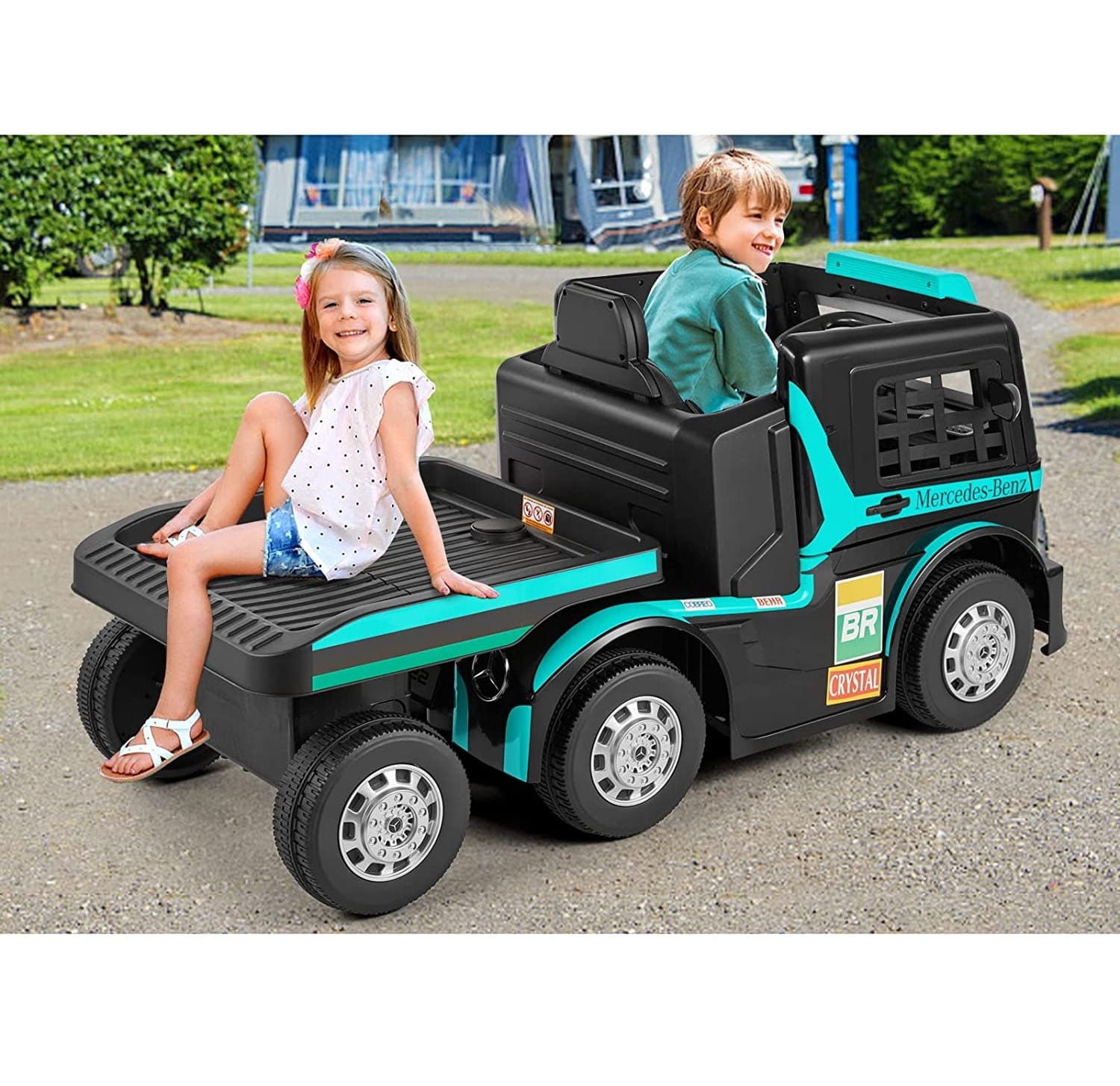 Mercedes Axor z naczepą jest istnym połączeniem solidności, najwyższej jakości i wzornictwa. Pojazd ten sprawdzi się zarówno podczas codziennych jazd po osiedlu, jak i w czasie weekendowych wycieczek poza miasto. Znajdujące się „pod maską” dwa silniki o mocy 45W każdy w połączeniu z dwoma akumulatorami 12V7Ah umożliwiają jazdę w prędkości od 3 do 8 km/h, co z pewnością zrobi wrażenie nie tylko na małym kierowcy, ale i przechodniach.